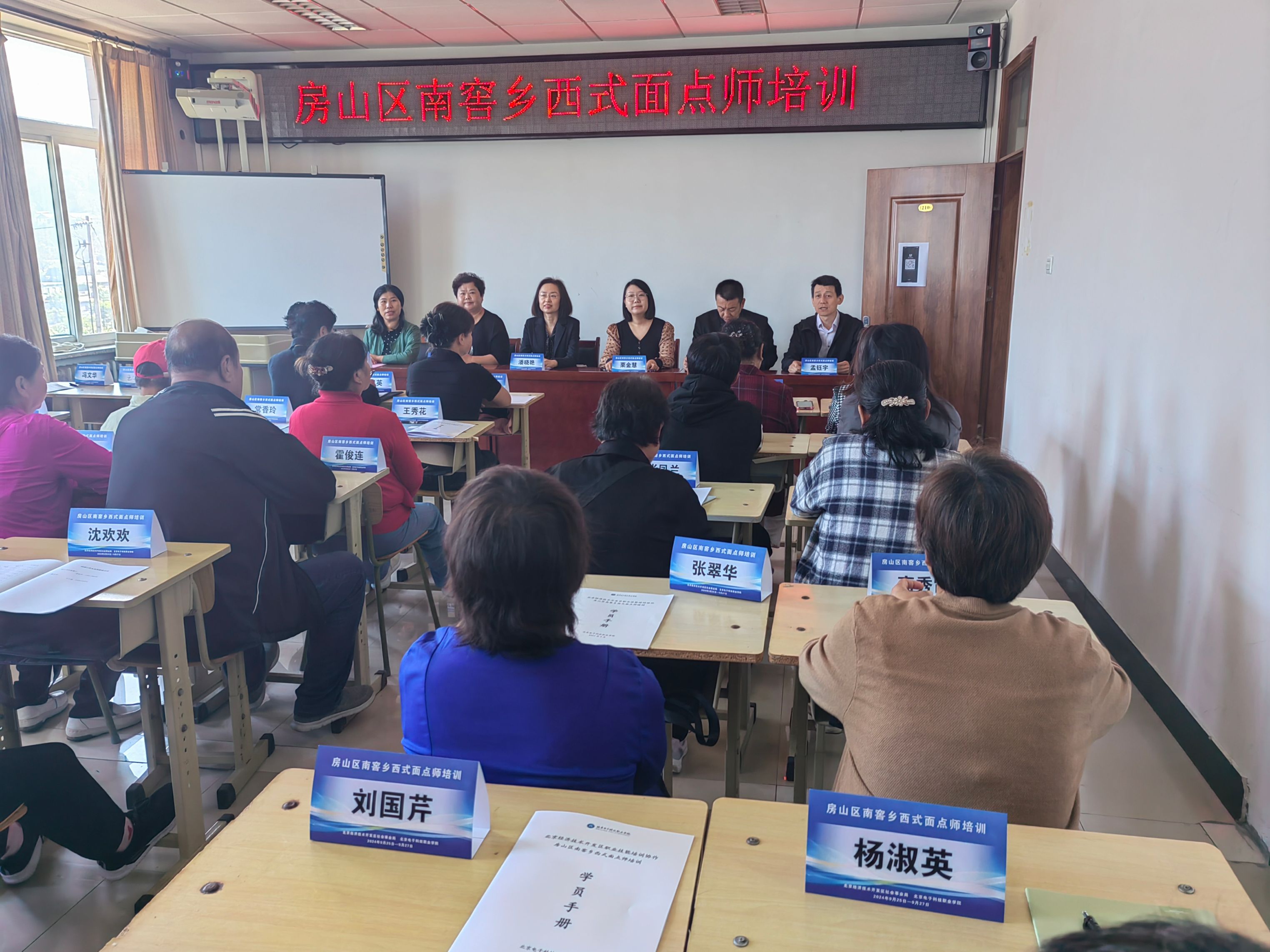 为深入贯彻落实习近平总书记对深化东西部协作和定点帮扶工作的重要指示,落实习近平总书记关于做好灾后恢复重建的重要讲话精神,实现脱贫攻坚成果同乡村振兴的有效衔接,9月25日,学校承办的房山区南窖乡西式面点师培训班在南窖乡社区成人职业学校开班。南窖乡妇联副主席付秀梅,南窖乡便民服务中心主任栗金慧,南窖乡教育助理、成人学校校长王文月,南窖乡成人学校主任陈平,北京电子科技职业学院继续教育学院院长潘晓艳以及南窖乡近30名就业创业人员出席了此次开班仪式,仪式由项目负责人孟钰宇主持。