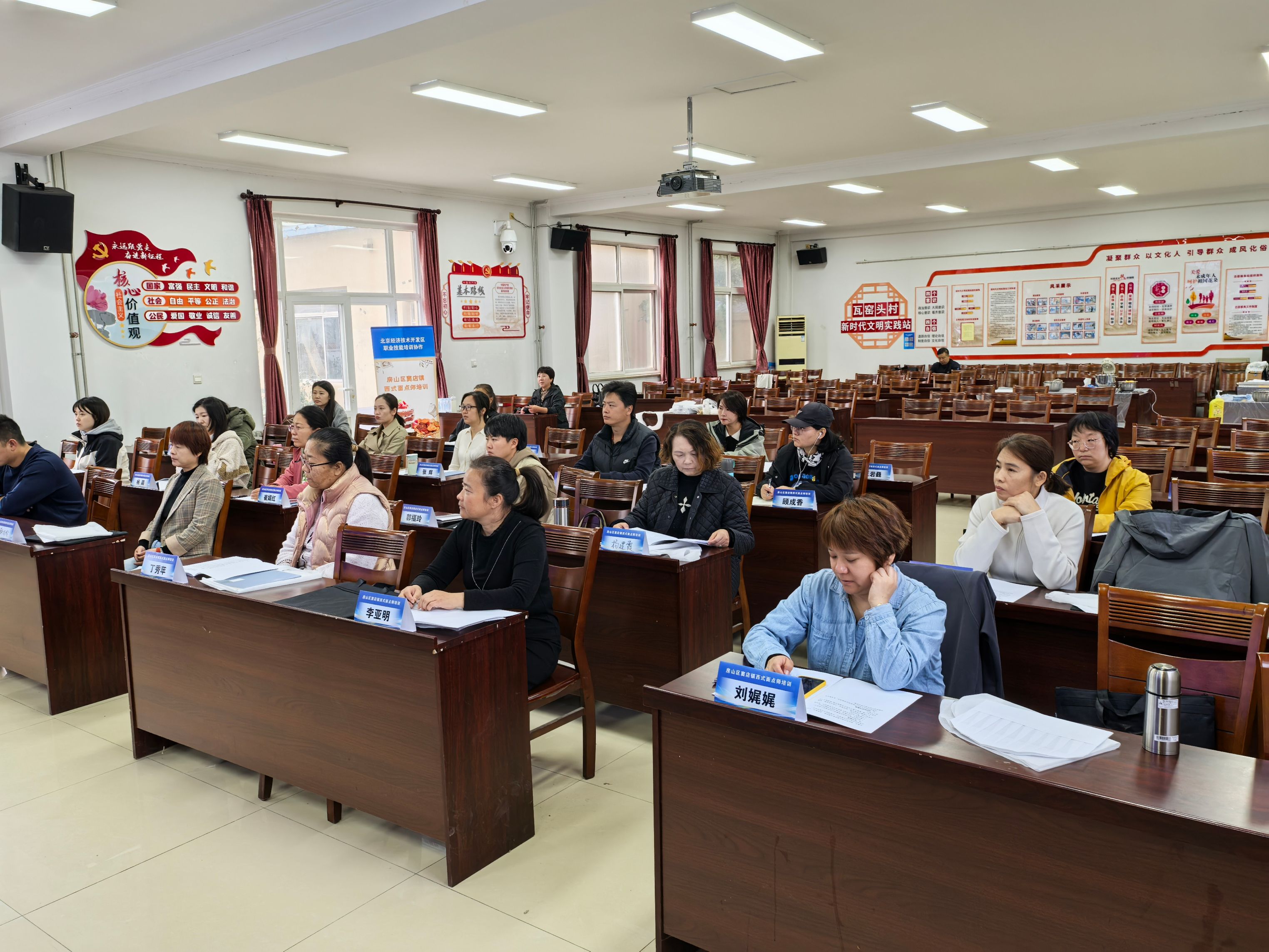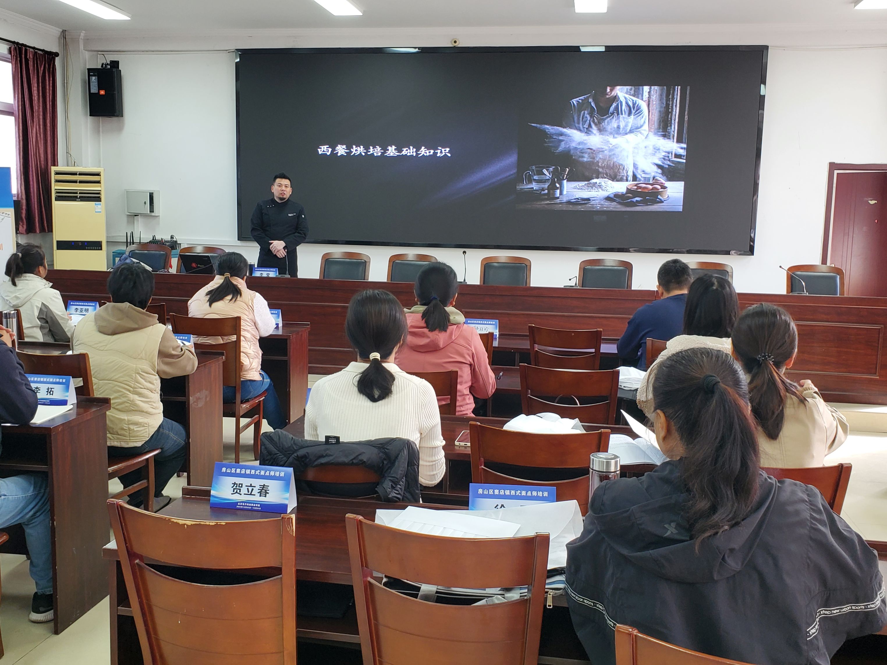 为深入贯彻落实习近平总书记对定点帮扶工作的重要指示及关于做好灾后恢复重建的重要讲话精神,实现脱贫攻坚成果同乡村振兴的有效衔接,10月22日,学校承办的房山区窦店镇西式面点师培训班在房山区窦店镇瓦窑头村党群活动中心开班。房山区窦店镇便民服务中心社保所陈琪,继续教育学院特聘餐饮专家李莹、餐饮助理刘伟以及窦店镇近30名就业创业人员参加开班仪式。开班仪式由项目负责人孟钰宇主持。