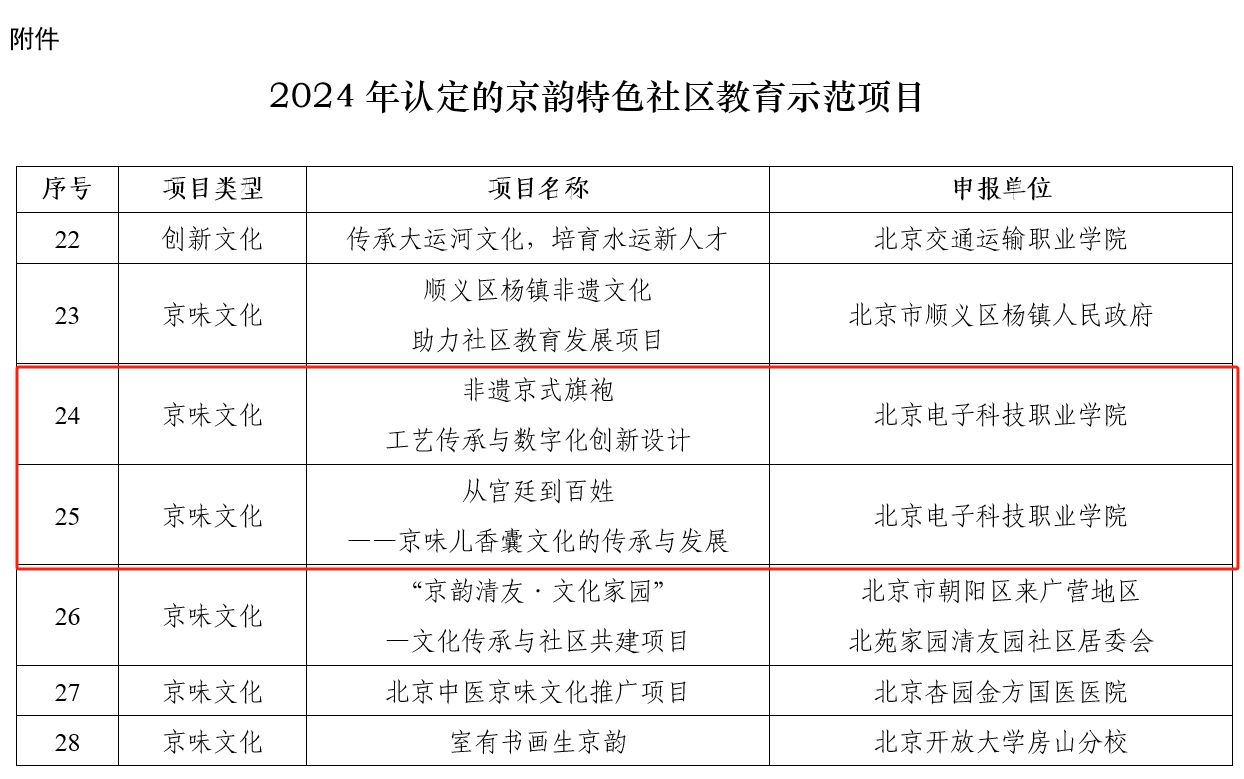 11月14日,北京市教育委员会发布《北京市教育委员会关于公布2024年认定的京韵特色社区教育示范项目的通知》。学校艺术设计学院的“非遗京式旗袍工艺传承与数字化创新设计”和生物工程学院的“从宫廷到百姓——京味儿香囊文化的传承与发展”2个项目入选2024年京韵特色社区教育示范项目。