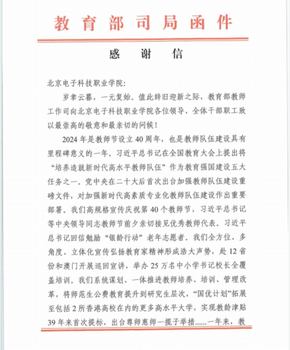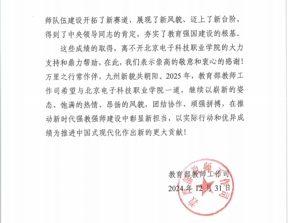 岁末年初,万象更新之际,学校收到教育部教师工作司发来的感谢信,信中对学校在 2024 年教师队伍建设工作中的大力支持与鼎力帮助表达了崇高敬意和衷心感谢。