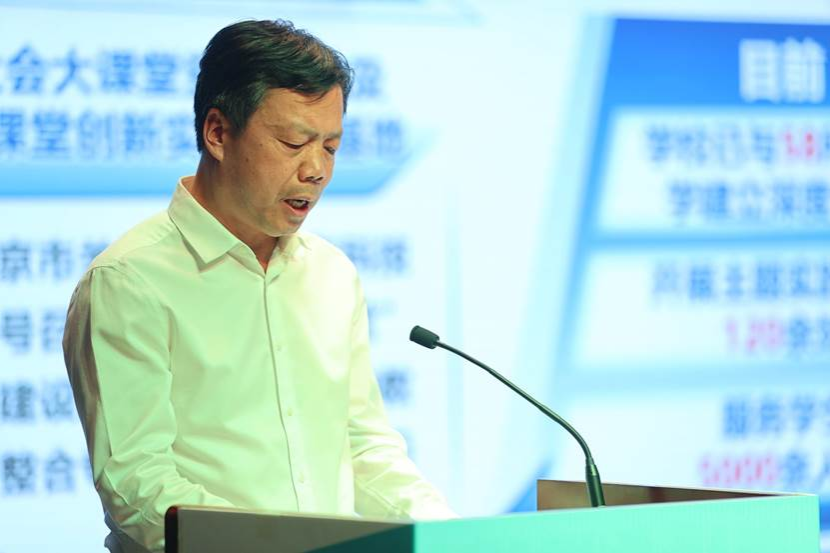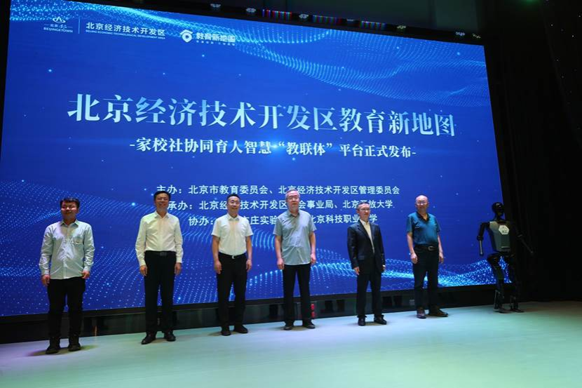 随后,张启鸿与参会相关领导共同登台,启动北京经开区家校社协同育人智慧“教联体”平台。在经开区教育新地图智慧“教联体”平台上,汽车工程学院智能网联产业学院,以课程视频的形式生动呈现了中小学生在实训室中的实践体验。