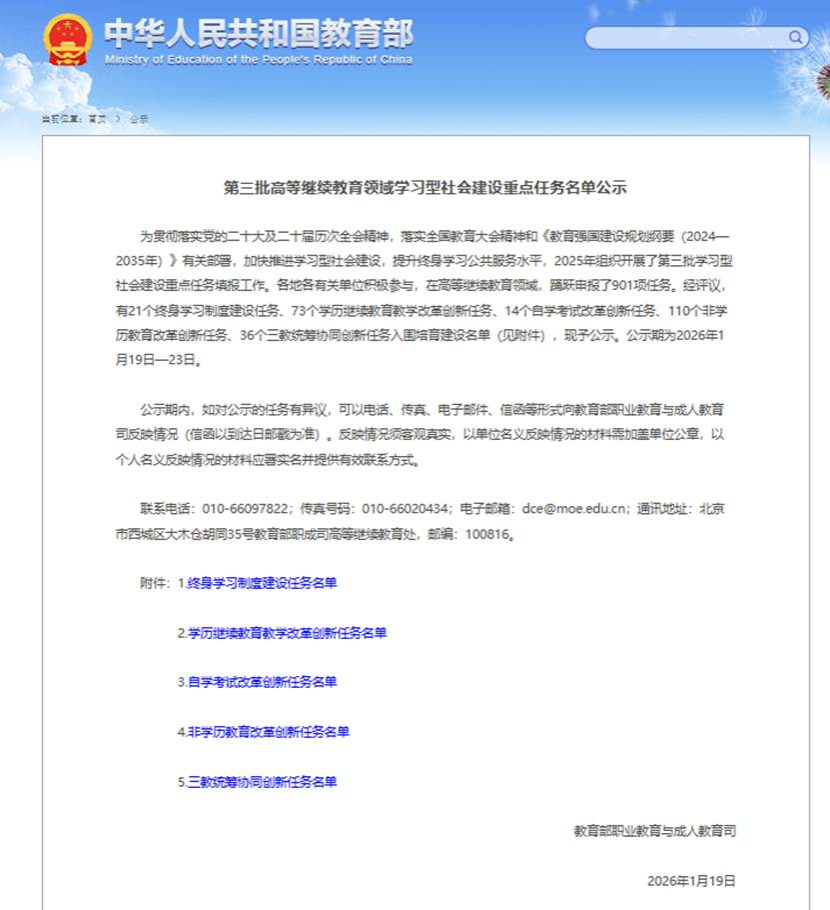 喜报!学校两个项目入选教育部第三批高等继续教育领域学习型社会建设重点任务