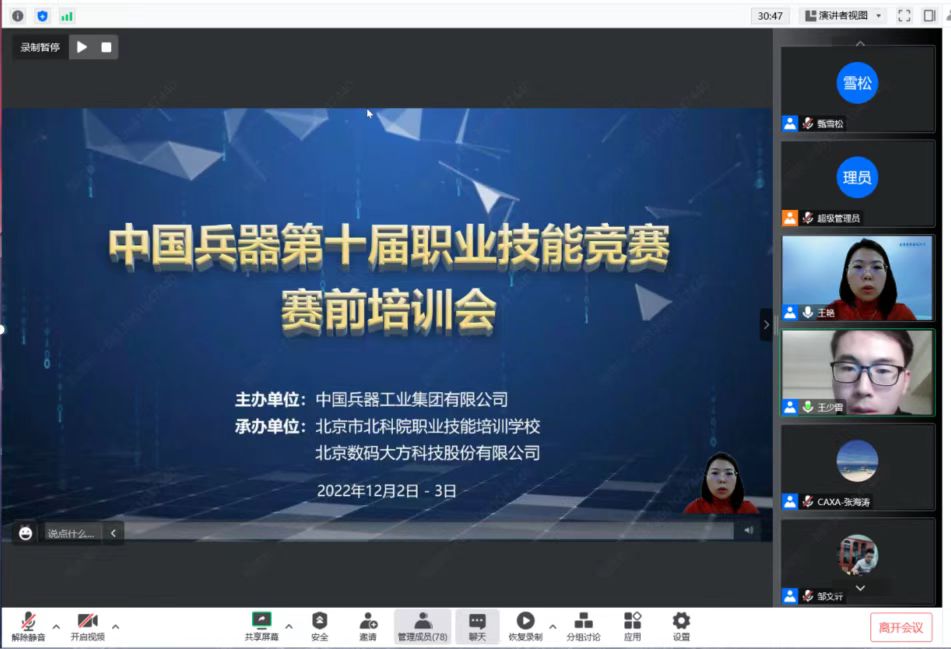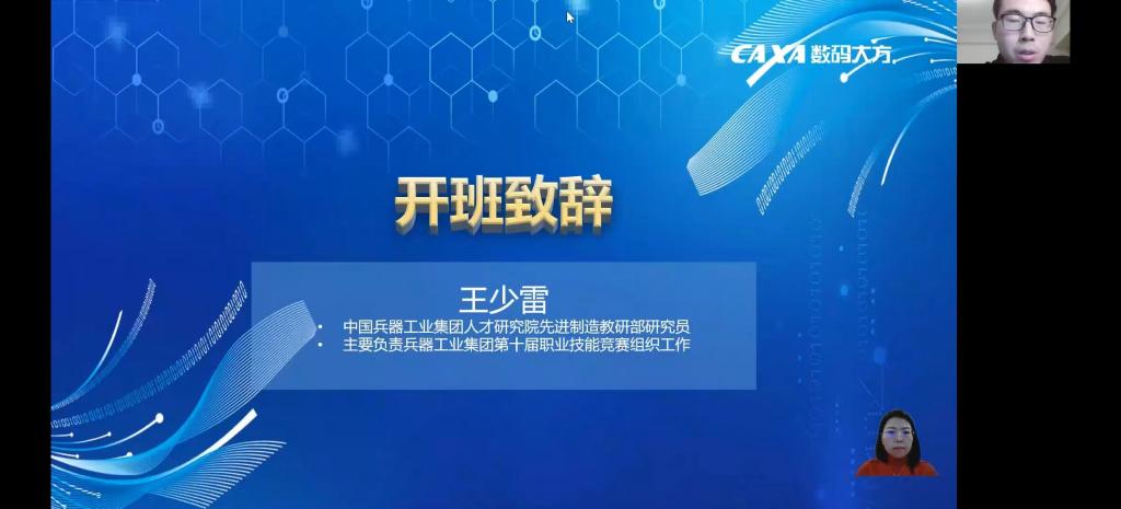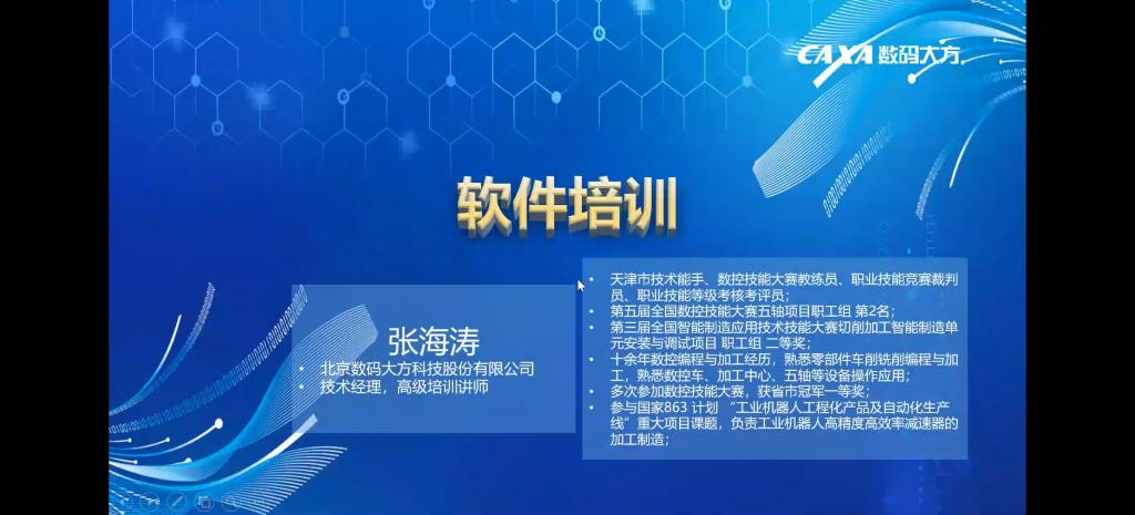第十届职业技能竞赛由中国兵器工业集团有限公司主办,北京电子科技职业学院和北京数码大方科技股份有限公司承担此次培训工作。培训采用线上的方式,内容包括讲解CAXA软件功能,解析大赛加工样题的CAD\CAM实施方案。