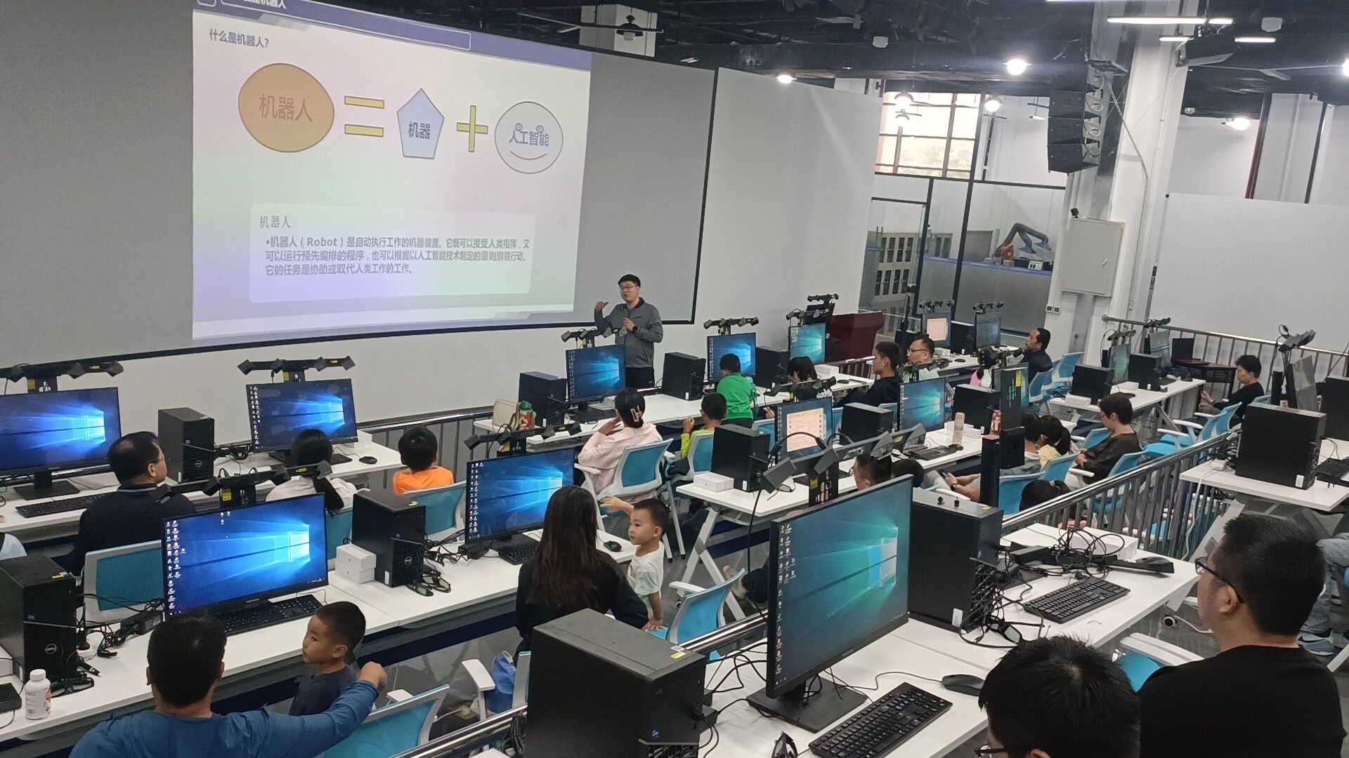 此次活动分为科普讲座和互动体验两个环节。在科普讲座环节,特别邀请了“北京市劳动模范”“中国大能手”及“北京大工匠”等多项荣誉获得者常锋老师担任主讲嘉宾。常锋通过一系列生动的视频案例,深入浅出地讲解了工业机器人在智能制造领域的广泛应用,使在座的家长和儿童对工业机器人的前沿技术和实际应用有了更为直观和深刻的理解。