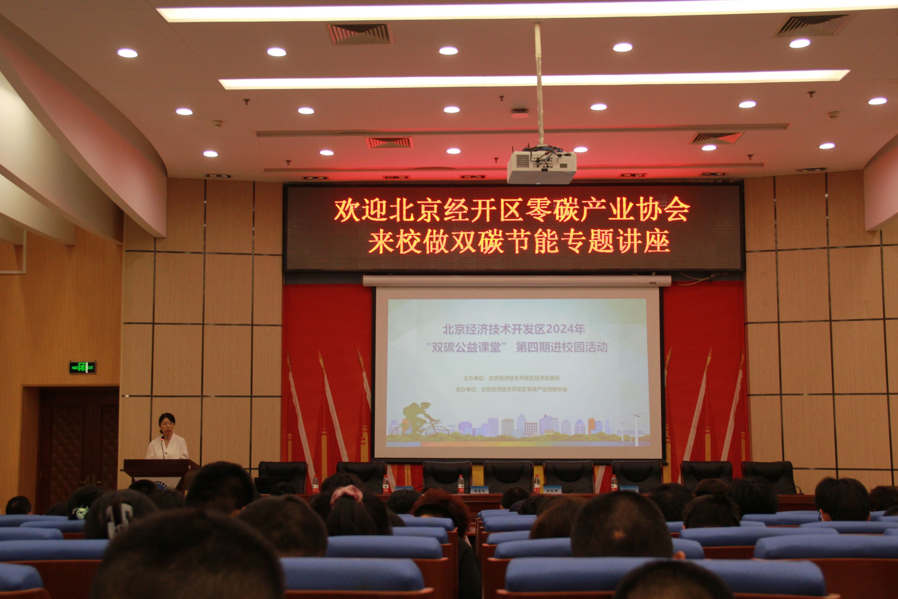 为深入了解双碳节能领域的最新动态、前沿技术和政策趋势,引导师生关注双碳领域科技创新发展,树立节能减排意识,养成珍惜资源、节约能源的良好习惯,6月26日,北京经济技术开发区2024年“双碳公益课堂”第四期进校园活动在汽车工程学院举办。北京经济技术开发区零碳产业创新协会会长杨爱民、协会理事陈辉、碳阻迹(北京)科技有限公司商务总监杨俊娜、金风零碳双碳事业部开发总监刘光华、汽车工程学院院长朱青松、党总支副书记陈洪华以及学院相关师生100余人参会,讲座由新能源汽车技术系教师王小娇博士主持。