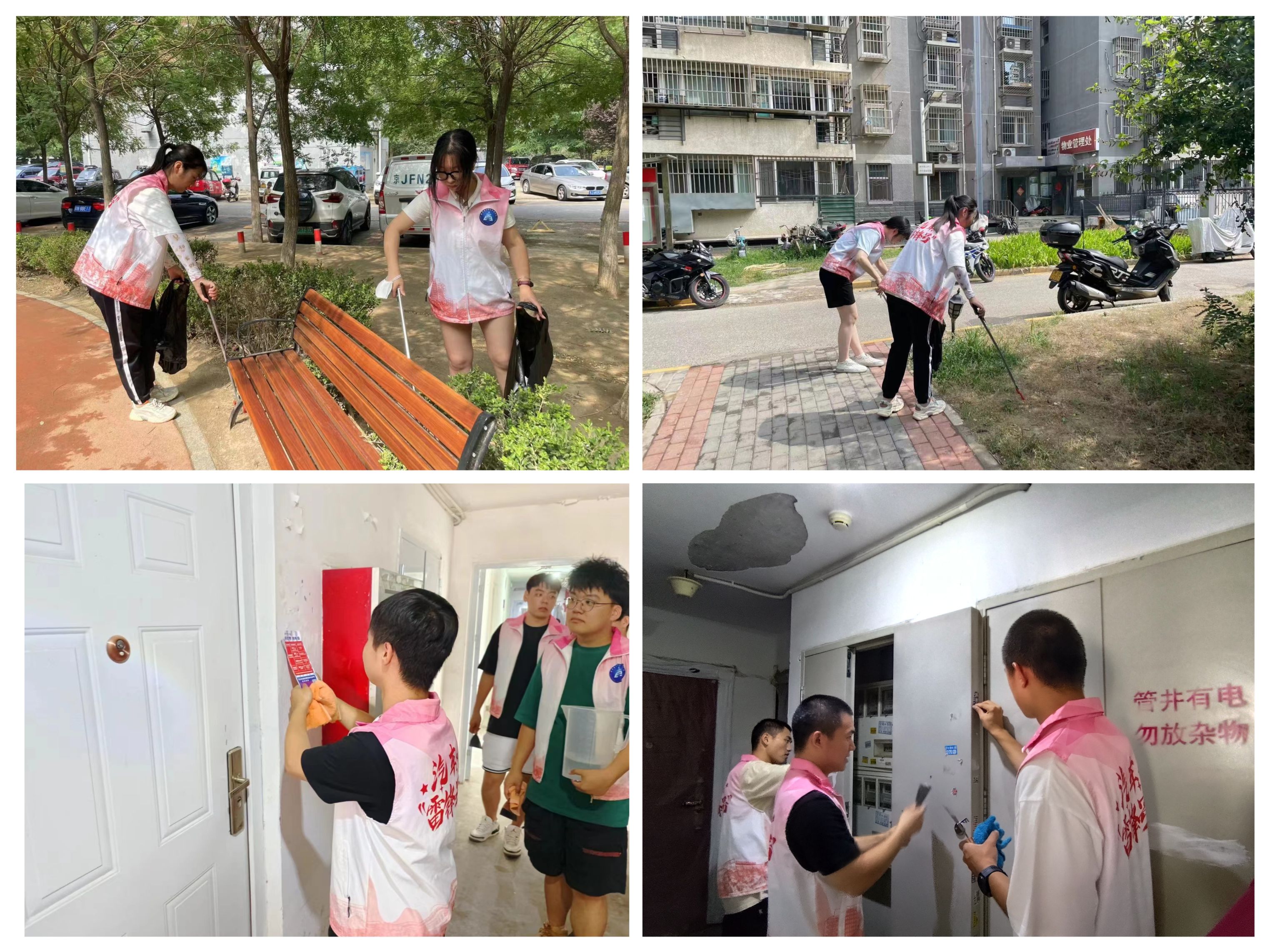 学生党支部师生开展了志愿服务活动。一组师生负责在居民楼内清除小广告,大家分工合作,有的拿抹布擦、有的拿铲子铲;另一组师生负责清理绿地杂草,清扫社区道路等公共区域。志愿服务活动持续一上午时间,大家汗流浃背,开心愉悦,收获满满。
