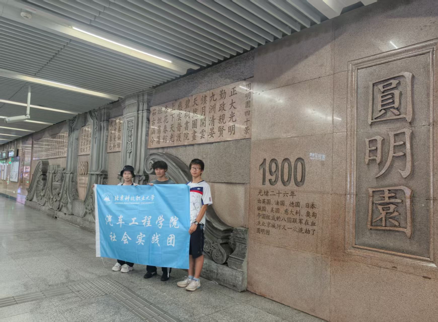 下一站,研学团队来到地铁1号线圆明园站。在圆明园遗址公园,成员们拍摄了断壁残垣的现状,通过讲解了解了这座昔日皇家园林的兴衰巨变——从鼎盛繁华到惨遭英法联军劫掠焚毁,再到新中国成立后的保护与整修。实践团在此上了一堂生动的爱国主义教育课,深刻体会到遗址所承载的民族记忆与警示意义。