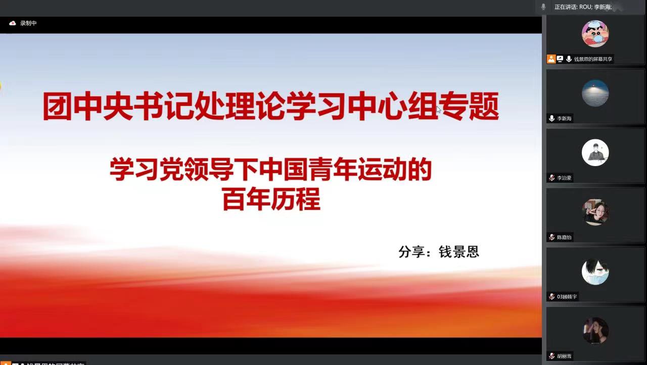 2022年4月6日,汽车工程学院团委、学生会、青协(以下简称“团学青”)全体学生干部、团学骨干集中学习了“团中央书记处理论学习中心组专题学习‘党领导下中国青年运动的百年历程’”会议精神。本次学习由钱景恩主持。