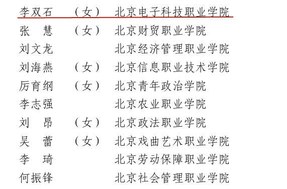 李双石,工学博士,教授,现任北京电子科技职业学院生物工程学院副院长。她长期坚守教书育人一线工作18年,爱岗敬业,勤奋努力,在教学改革、科研服务、学生工作、专业和团队建设等各项工作中取得了较为突出的成果。曾荣获“教育部课程思政教学名师”“北京市职业院校专业带头人”“北京市高等学校青年教学名师”“北京市师德先锋”“北京市属高校青年拔尖人才”等市级以上荣誉称号或人才项目资助,曾获“优秀教师”“师德榜样”“学生心目中的好老师”“十佳班主任”“十佳毕设指导教师”等多项校级荣誉称号。