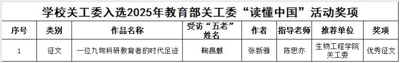 近日,2025年“读懂中国”活动评审结果揭晓。生物工程学院关工委报送的征文作品《一位九旬科...【详细信息】