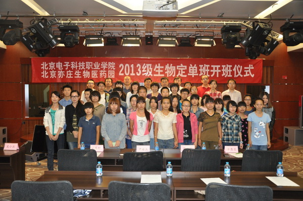 2013年9月11日,生物工程学院生物技术系2013级生物医药“定单班”的开班仪式在北京市经济开发区亦庄生物医药园多功能厅举行。参加开班仪式的有:生物技术及应用专业“定单班”28名学生、在生物医药园进行生物医药生产实训的28名3年级学生、亦庄生物医药园常务副总经理尹希杰、副总经理吴小兵、副总工程师及技术部经理连忠辉、北京电子科技职业学院校长助理么居标、招生处处长赵永良、示范校办公室主任林洪、亦庄生物医药园入驻企业五加合总经理董小岩、华昊中天总经理邱荣国、生物工程学院院长辛秀兰、党委书记熊伟、生物技术系主任王晓杰以及生物工程学院教师们。会议由生物工程学院党委书记熊伟主持。