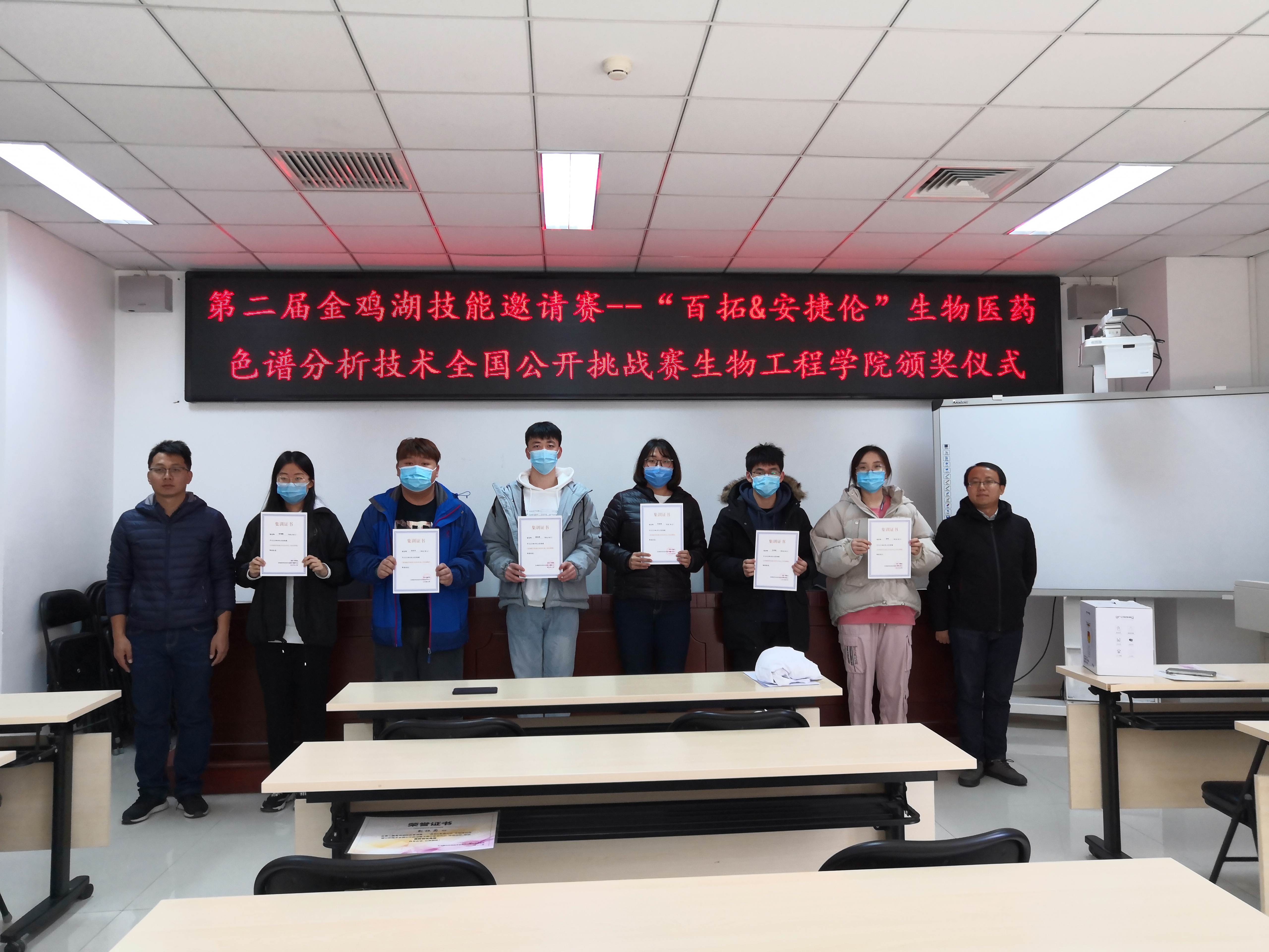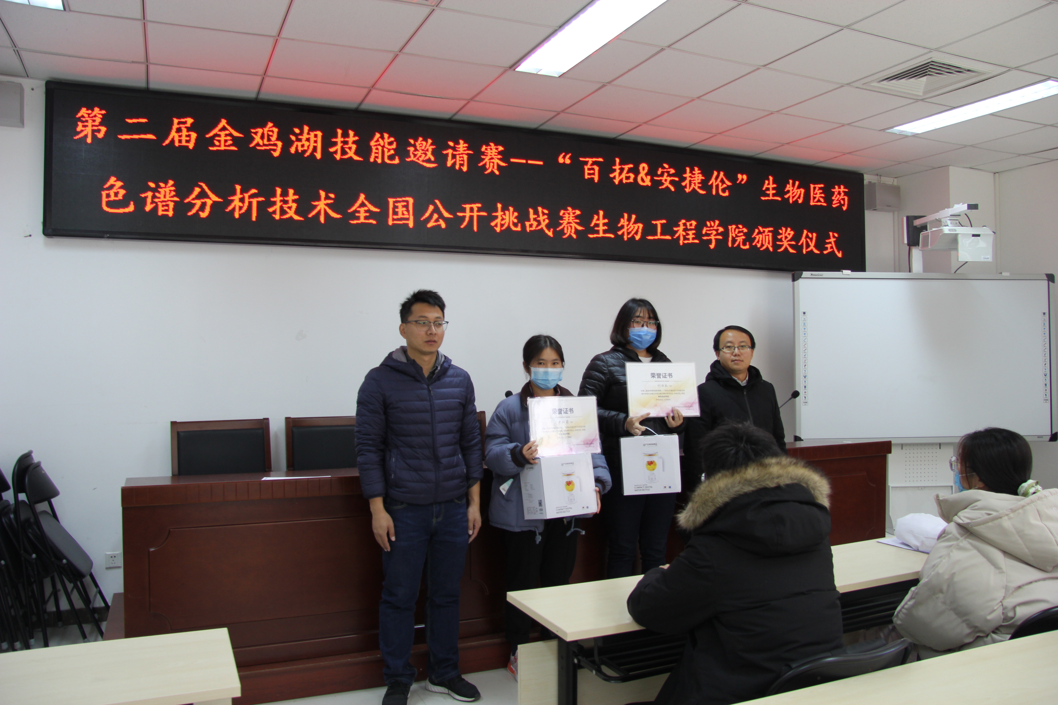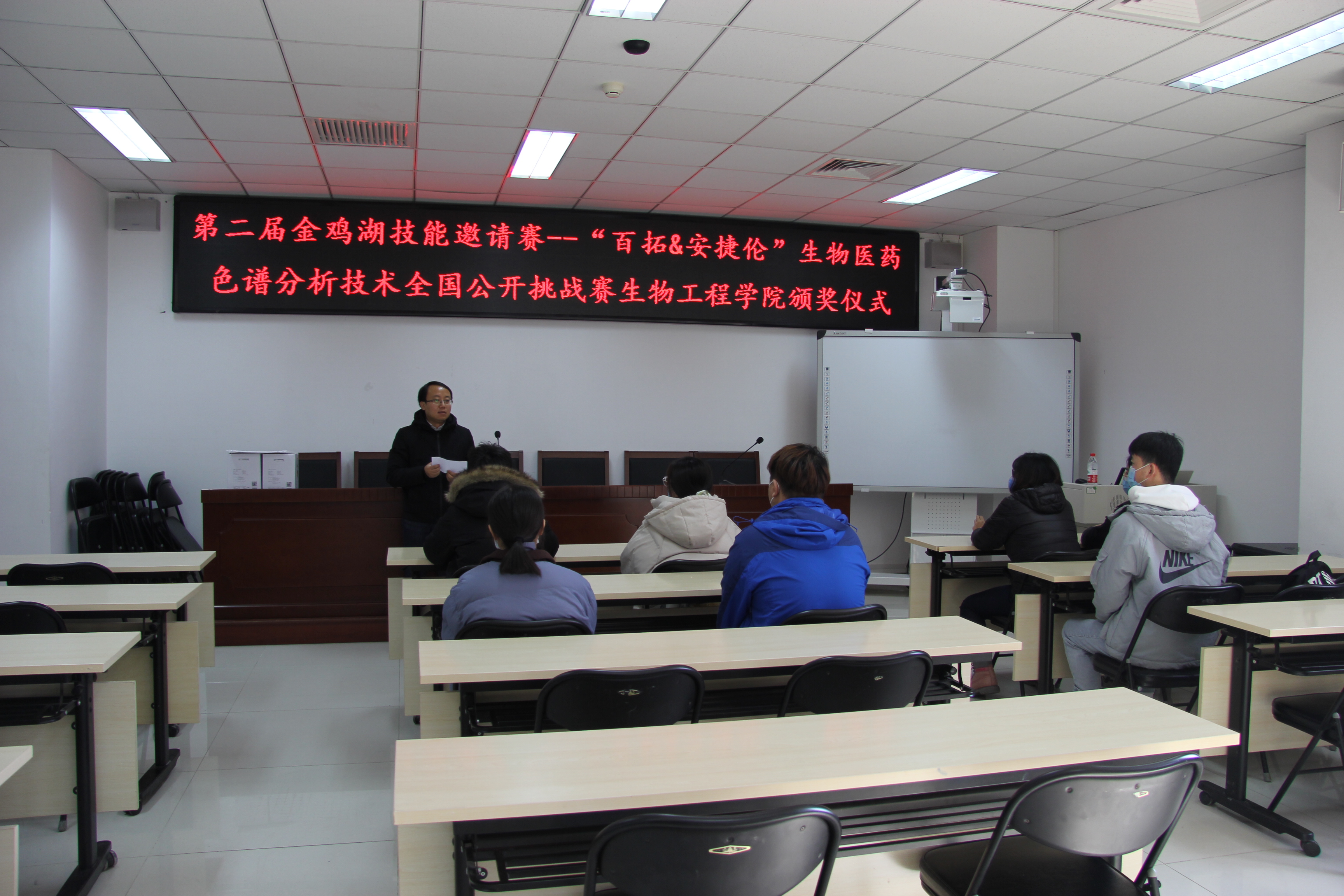 11月23日中午,生物工程学院在生物楼433教室举行了第二届金鸡湖技能邀请赛—“百拓&安捷伦杯”生物医药色谱分析技术全国公开挑战赛的颁奖仪式。生物工程学院副院长陈亮出席,获奖同学和参赛同学代表参加,仪式由辅导员胡浩主持。