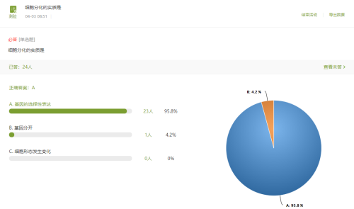 网络在线课堂,教师除了通过后台统计的数据来获取学生学习状态之外,在线互动也是很重要的一个方面,但是课堂活动开展过多,也不利用学生的正常学习,而且有时因为网络延迟,也会导致学生和教师的信息交换不及时,所以在备课期间的要考虑好课上什么时候进行互动,互动的方式和内容是什么。我个人的常用方式是将学习指导和提示通过学习通通知发放,学习的重点梳理通过讨论区发放,核心问题的提问采用学习通课堂活动中的测试发放,可以实时掌握学生核心知识掌握情况(图3),实时调整教学,答疑解惑,相关知识点测验的发放的时间建议在学生学习相关知识之后。对于个别学生的提问可以采用选人功能来提问。对于学习界面的章节测验设置建议采取设置一定的及格分数,并提供重做的机会,有利于学生不断思考,巩固加深对知识点的记忆和理解,也可以吸引一部分未能及格的学生在课后进行重做。