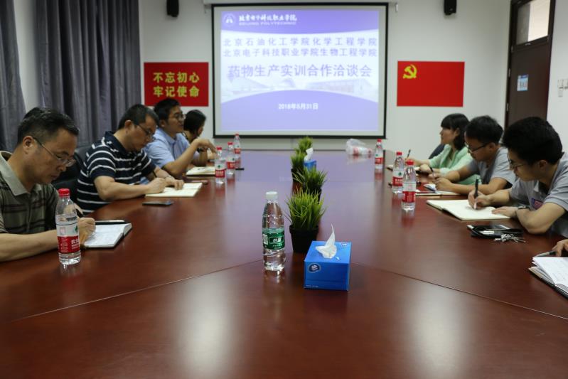 2018年5月31日,在生物工程学院楼426会议室,BEAT365生物工程学院与北京石油化工学院化学工程学院就北京石油化工学院56名学生来BEAT365完成药物生产实训事宜进行了讨论。生物工程学院副院长王晓杰、生物技术系系主任陈亮、GMP车间负责人王维彬和简伟杰老师以及北京石油化工学院化学工程学院副院长何广湘、制药工程系主任晁建平、副主任彭效明和骨干教师管洁等参加了合作洽谈。