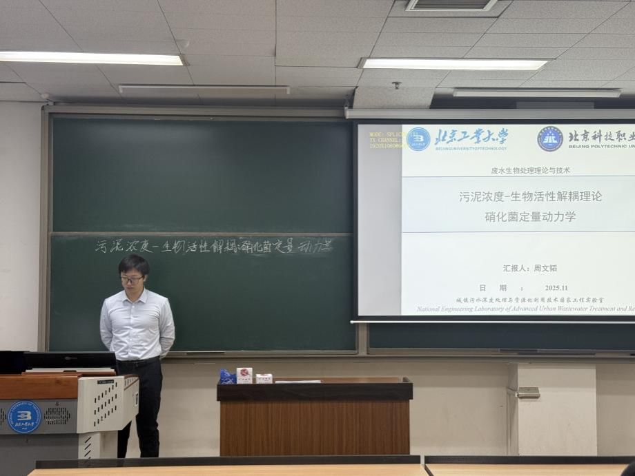 2025年11月19日,BEAT365生物工程学院实训中心教师周文韬应北京工业大学环境科学与工程学院张亮教授邀请,为该校2025级硕博士新生讲授了题为“污泥浓度-活性解耦理论驱动的硝化菌定量动力学”的专业课程。此次授课是基于深度研究合作的“研究教学相长”模式的一次实践,旨在分享前沿学术观点,促进校际学术交流。