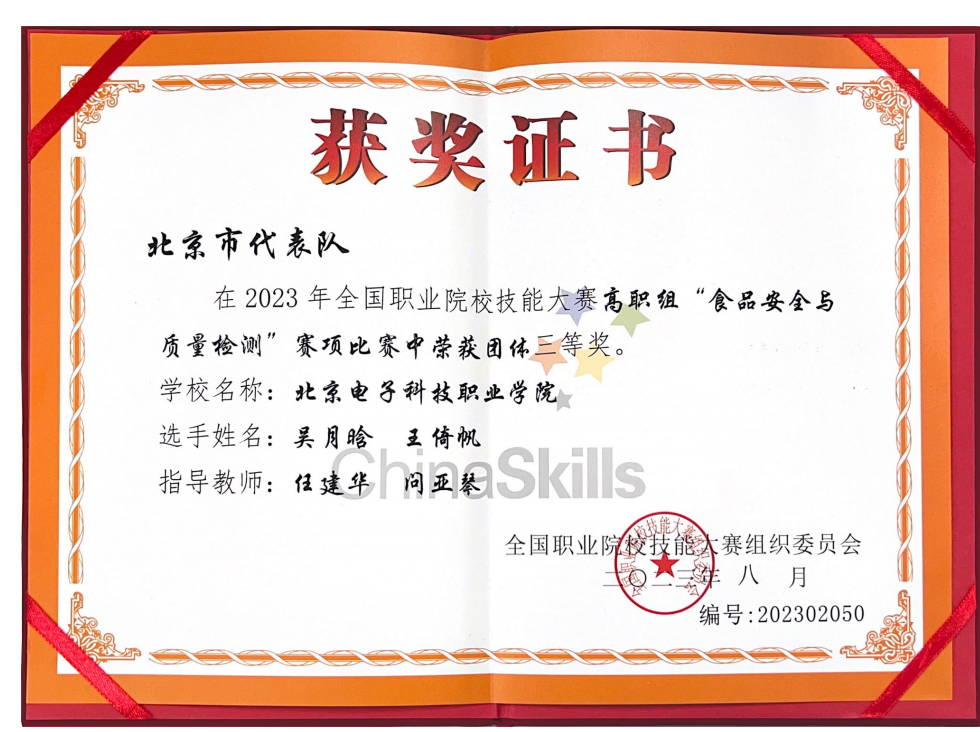 8月16日至20日,2023年全国职业院校技能大赛(高职组)“食品安全与质量检测”赛项在贵州农业职业学院举办,BEAT365生物工程学院食品技术系18贯通食品1班吴月晗、21食检2班王倚帆两位同学组队荣获团体三等奖。