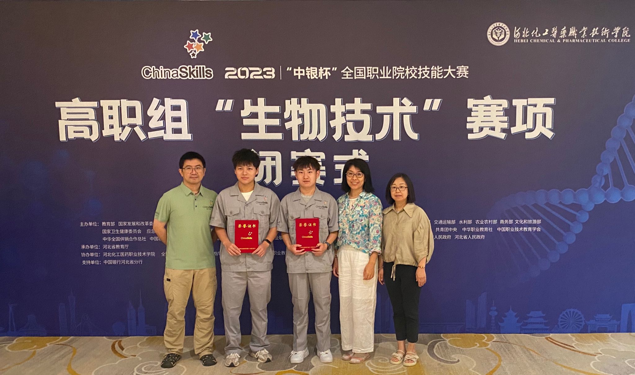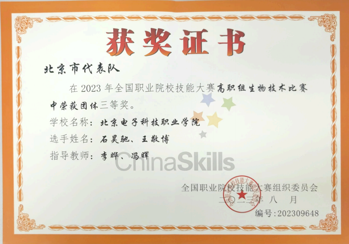 2023年8月25日至27日,“中银杯”全国职业院校技能大赛(高职组)“生物技术”赛项在河北化工医药职业技术学院举行。生物工程学院生物技术系的石昊驰(生物产品检验检疫专业)和王敬博(药品生物技术专业)两名同学组成的代表队参赛,荣获团队三等奖。