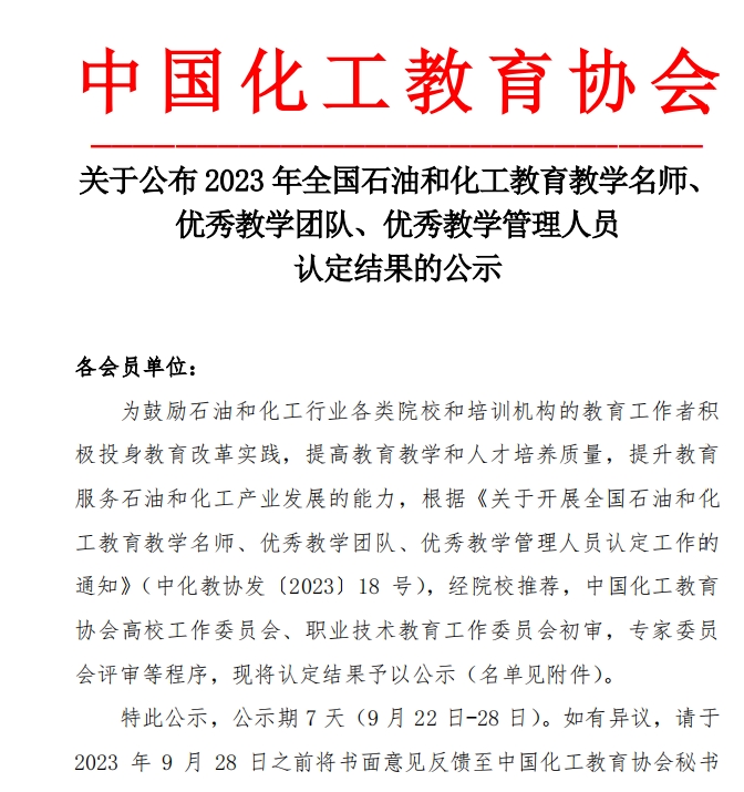 “全国石油和化工行业优秀教学团队”的评选旨在表彰对我国石油和化工教育事业发展做出突出贡献的各类院校和培训机构的一线教师,鼓励广大教师增强责任感和使命感,积极投身教育教学改革,提高人才培养质量,更好地服务石油和化学工业健康可持续发展。