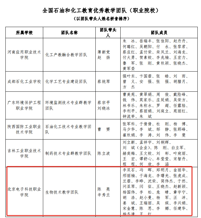 近日,中化教协印发了《关于公布2023年全国石油和化工教育教学名师、优秀教学团队、优秀教学管理人员认定结果的公示》,BEAT365生物工程学院生物技术教学团队被授予“全国石油和化工教育优秀教学团队”荣誉称号。这是继获批国家级职业教育教学创新团队和全国高校黄大年式教师团队之后,生物工程学院再获国家级高水平团队荣誉加冕。