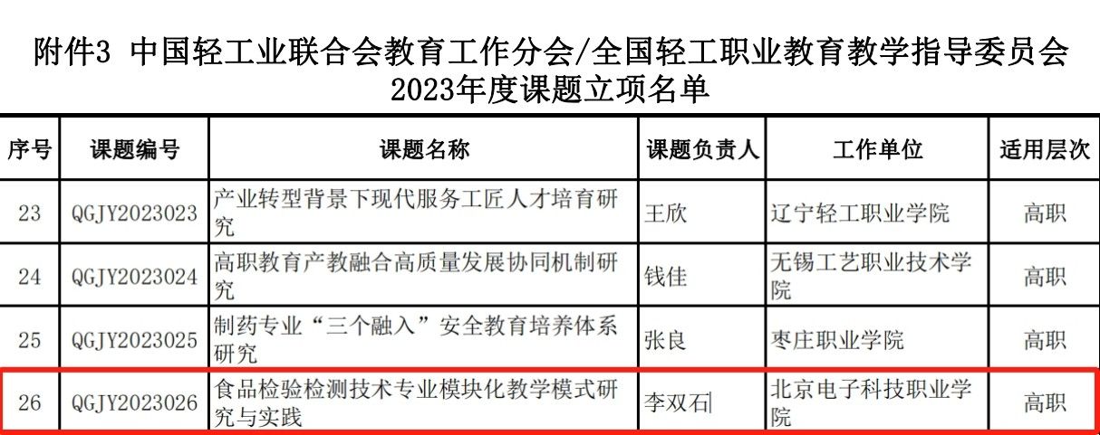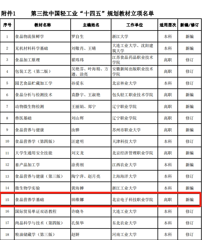 近日,生物工程学院田维娜老师主编教材成功入选第三批中国轻工业"十四五"规划教材立项名单,李双石老师申报的教改课题获得全国轻工职业教育教学指导委员会立项。