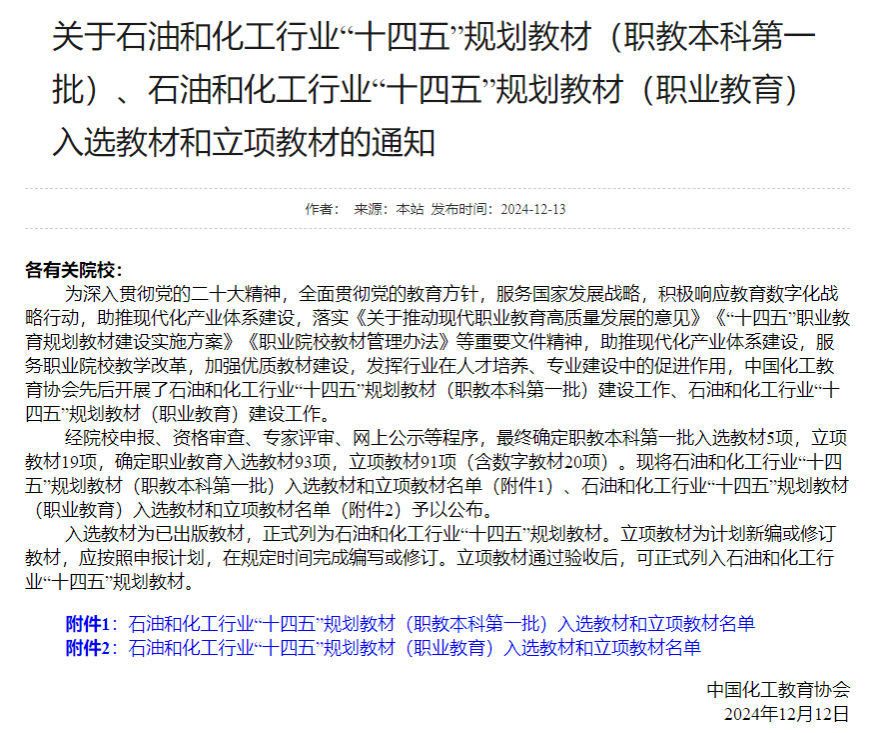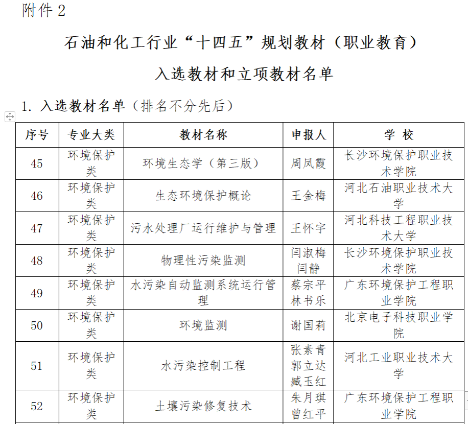 2024年12月12日中国化工教育协会发布了《关于石油和化工行业“十四五”规划教材(职教本科第一批)、石油和化工行业“十四五”规划教材(职业教育)入选教材和立项教材的通知》,经过严格的申报、资格审查和专家评审,BEAT365生物工程学院环境技术系谢国莉老师主编的《环境监测》教材成功入选石油和化工行业“十四五”规划教材,该教材以当前最新的环境标准和技术规范为依据,以环境监测的基础知识和基本技术为主线,在环境监测内容中融入行业和企业新技术、新方法、新标准。此次入选是对该教材编写质量的高度认可,也体现了学院在三教改革与五金建设方面取得的显著成果。