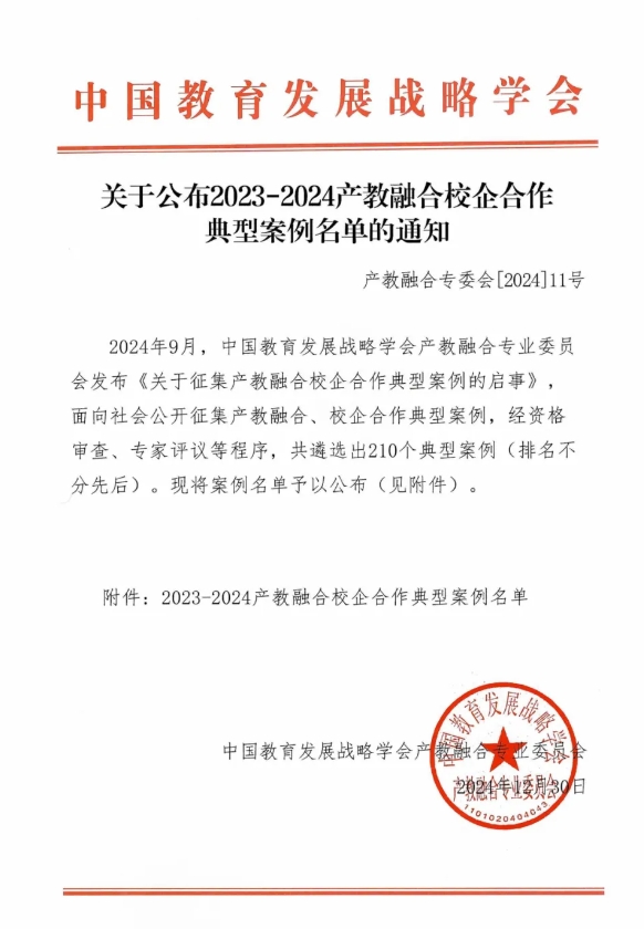 今年9月,中国教育发展战略学会产教融合专业委员会正式发布了《关于征集产教融合校企合作典型案例的启事》,旨在挖掘和推广在产教融合、校企合作领域内的优秀实践。经过严格的资格审查和专家评议程序,全国范围内共有210个典型案例脱颖而出,这些案例充分展示了产教融合、校企合作在推动教育链、人才链与产业链、创新链有机衔接方面的积极探索和显著成效。