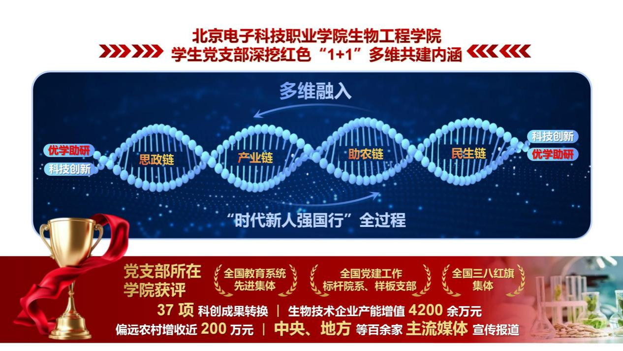 北京电子科技职业学院生物工程学院学生党支部深挖红色“1+1”多维共建内涵,以“优学助研”科技创新“双螺旋”为主线,构建“思政链—产业链—助农链—民生链”四链并行,多维融入“时代新人强国行”全过程。党支部所在学院获评“全国教育系统先进集体”、“全国党建工作标杆院系、样板支部”、“全国三八红旗集体”。近年来,完成37项科创成果转换,助力生物技术企业产能增值4200余万元,实现偏远地区每年农业增收近 200 万元,受到中央、地方等百余家主流媒体宣传报道。