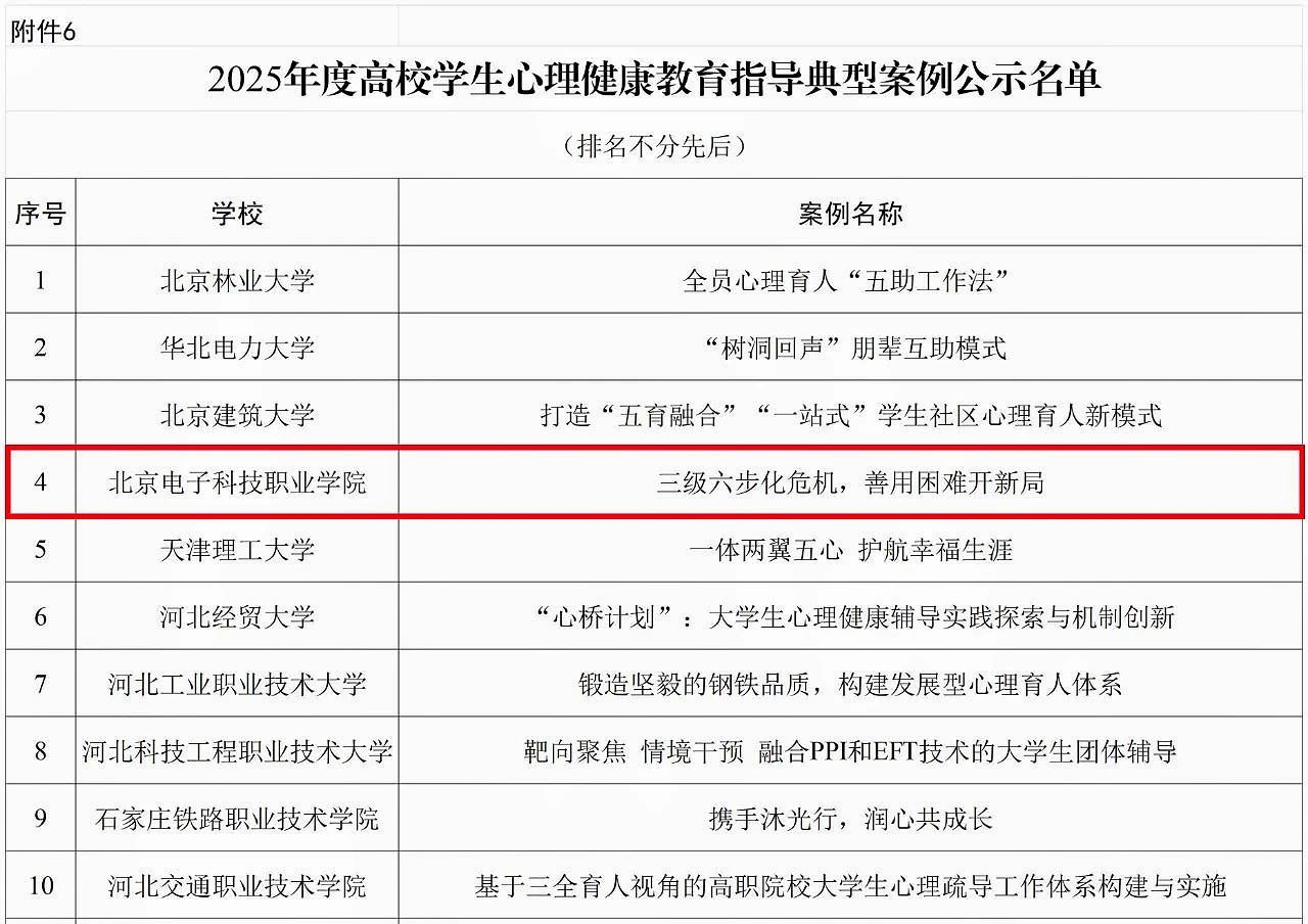 近日,教育部办公厅公布了2025年度高校思想政治工作质量提升综合改革与精品建设项目入选名单。学院赵新颖教授申报的《三级六步化危机,善用困难开新局》案例入选2025年度高校学生心理健康教育指导典型案例。这是学校继2024年获批实践育人精品项目后再次成功入选,实现了在这一国家级项目上的新突破。