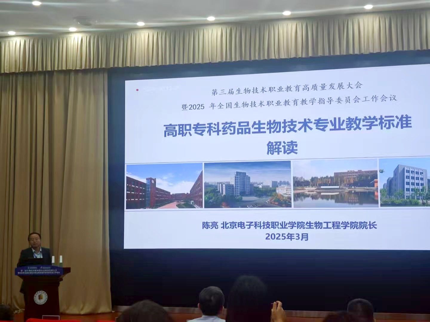 会上,BEAT365生物工程学院院长陈亮作《高职专科药品生物技术专业教学标准解读》专题报告。报告从专业调研报告专业简介、专业教学标准、专业教学标准修(制)订说明等四个标准制订文件展开,主要依照标准职业面向定位、培养目标与规格、课程体系设计、实践教学环节及师资队伍建设等11个要素,系统阐释了新标准对接生物医药产业数字化、智能化趋势的核心思路,强调岗位需求为导向优化课程设置,强化基因工程、生物制品生产等核心技能培养,为高职专科人才培养提供基本依据。