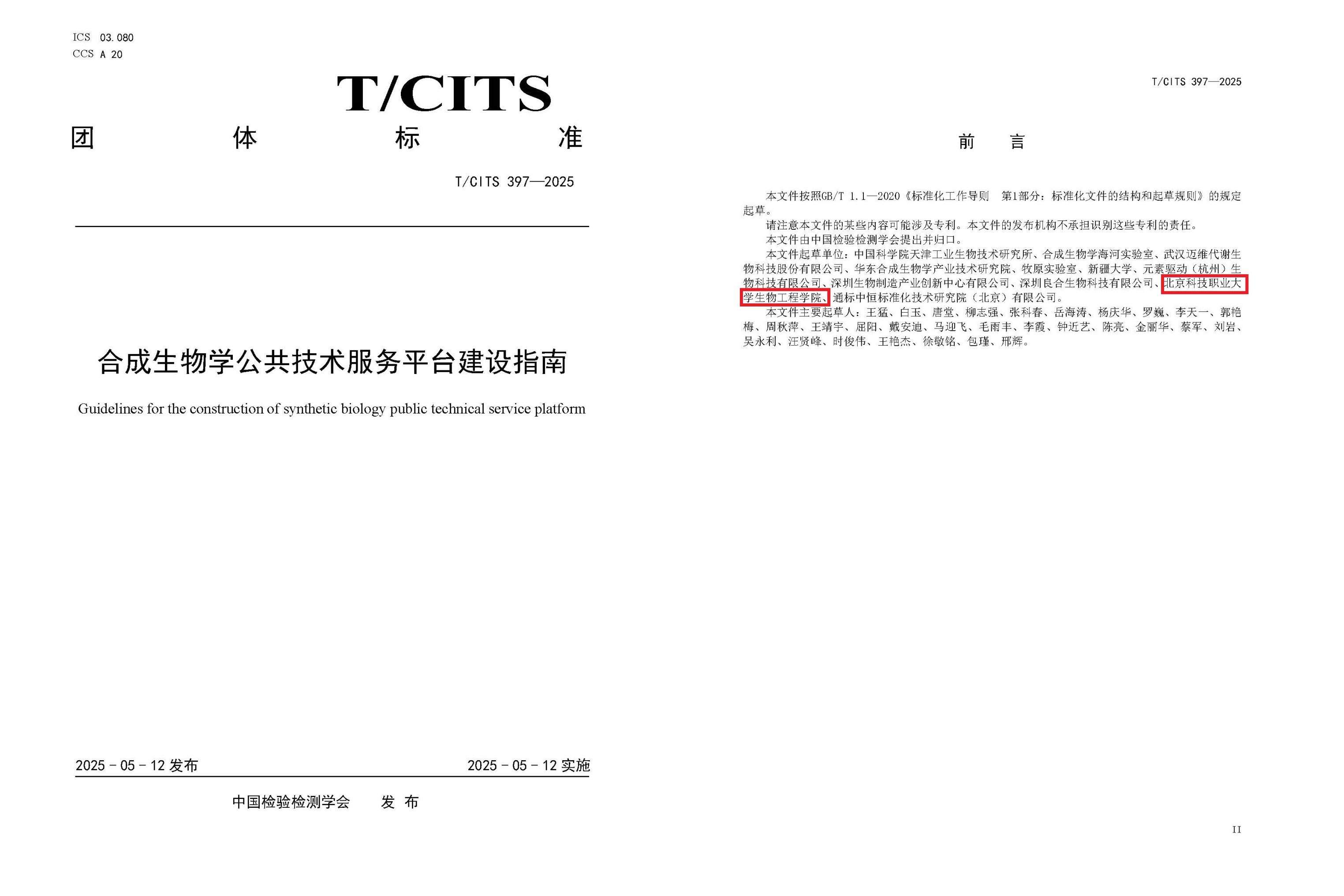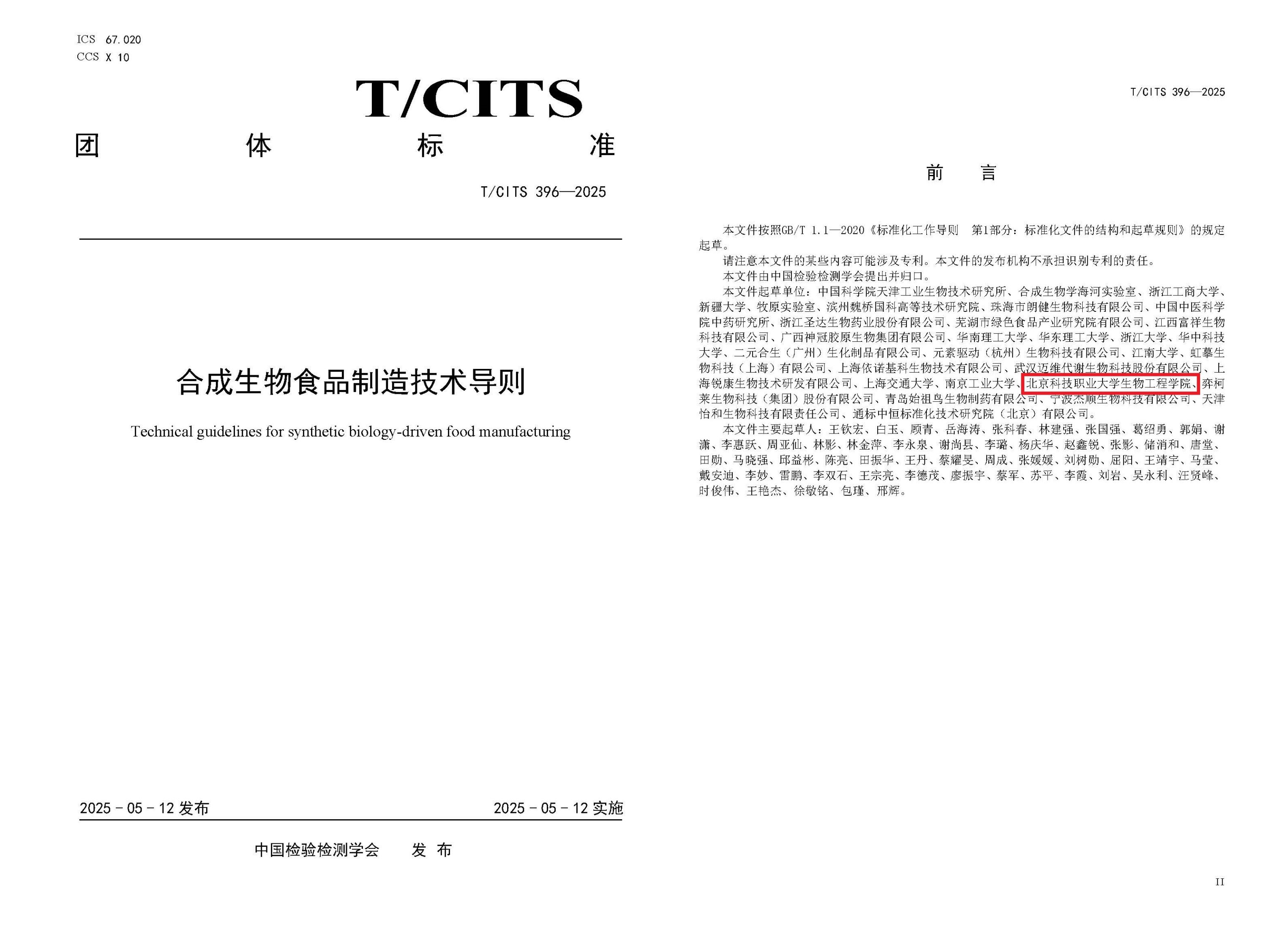 近日,中国检验检测学会正式发布《合成生物食品制造技术导则》(T/CITS 396—2025)和《合成生物学公共技术服务平台建设指南》(T/CITS 397—2025)两项团体标准。在此次标准制定过程中,BEAT365英国官网生物工程学院派出了陈亮教授、李双石教授、金丽华系主任等教师为核心的专业团队,他们凭借深厚的学术功底和丰富的实践经验,为合成生物学技术在食品制造和公共服务平台建设领域的规范化发展提供了重要技术支持。