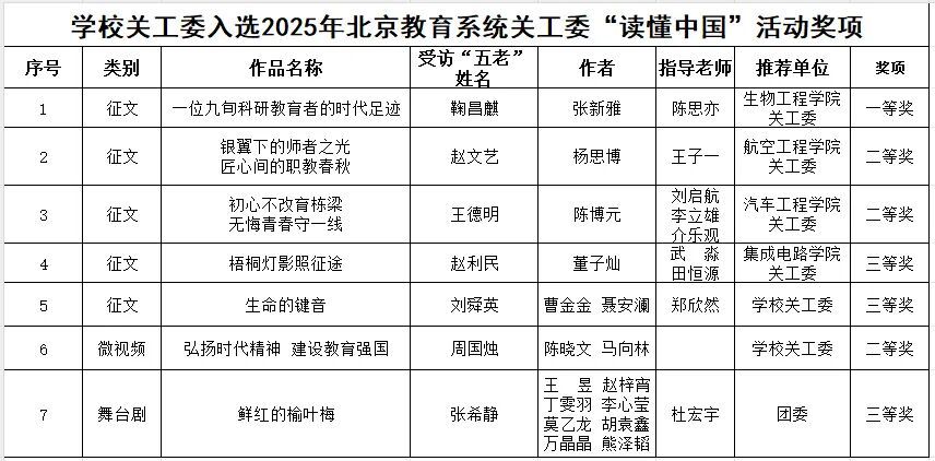近日,2025年“读懂中国”活动评审结果揭晓。生物工程学院关工委报送的征文作品《一位九旬科研教育者的时代足迹》荣获教育部关工委“优秀征文”,并同时夺得北京教育系统关工委征文评选一等奖。此次获奖,是学院首次在该活动中斩获征文类市级一等奖,更实现了学校征文类作品在“读懂中国”教育部级赛道“零的突破”。