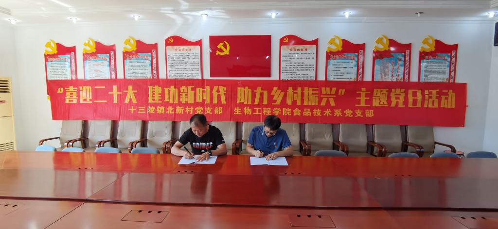 9月23日,生物工程学院食品技术系党支部与昌平区十三陵镇北新村社区党支部开展“喜迎二十大,建功新时代”博士团助力乡村振兴支部共建活动,共同签署了共建协议书。