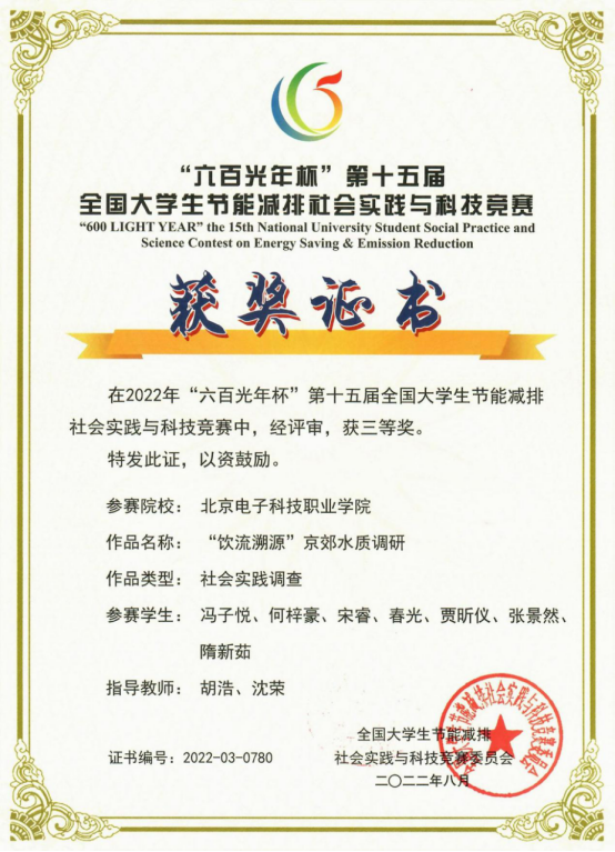 作为首次参加全国大学生节能减排社会实践与科技竞赛的队伍,生物工程学院自今年3月关注比赛以来,积极组织备赛,打磨参赛作品,最终共有9支队伍成功报名,其中1项为社会实践与调查报告作品,8项为科技作品。经过激烈比拼,生物工程学院社会实践与调查报告作品——“饮流溯源”京郊水质调研项目获得获三等奖,学校获得第十五届全国大学生节能减排社会实践与科技竞赛优秀组织奖。