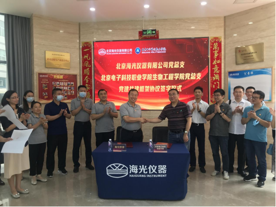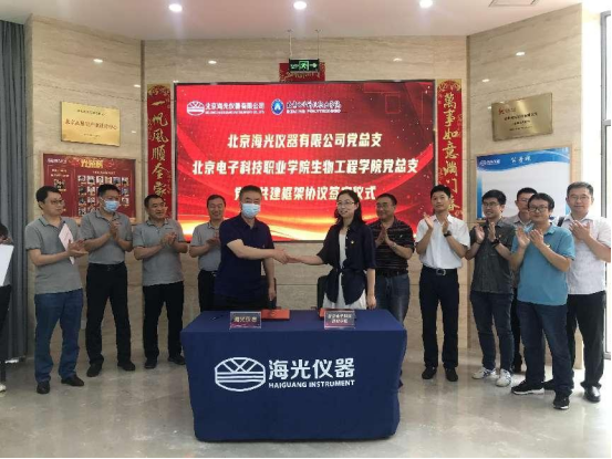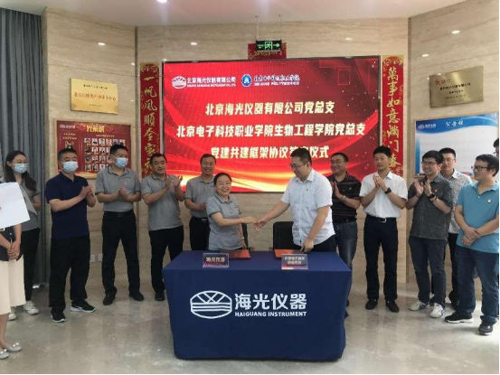 生物技术系党支部、食品技术系党支部、环境技术系党支部分别与北京海光仪器有限公司第一党支部、第二党支部,北京奥地探测仪器有限公司党支部签署支部共建协议,开展红色“1+1”主题党日活动,就支部建设进行深入探讨。
