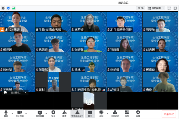 生物工程学院始终坚持以学生为中心,在学业辅导过程中,多次组织调研,深入了解学生的辅导需求,动态调整辅导内容。通过组织学生学业辅导座谈会,深入了解学业辅导效果,部署接下来的学业辅导工作。自6月3日以来,生物工程学院在21级高职学生中累计开展线上团体辅导8次,参与学生人数258人次,辅导内容涵盖高数,有机化学,生物化学和人工智能等多门学科;同时丰富辅导载体,建立了21高职学业互助微信群,鼓励优秀学生担任学业辅导志愿者,承担群内答疑工作,现有志愿者人数31人,群成员数95人。此外,对于学习难的学生建立了一对一辅导机制,充分发挥朋辈帮扶作用,累计建立帮扶小组45组,帮扶对象45人。生物工程学院环境系教师路鹏也参与到此次学业辅导中,形成了第一课堂和第二课堂的同频共振,构建了师生学习共同体。