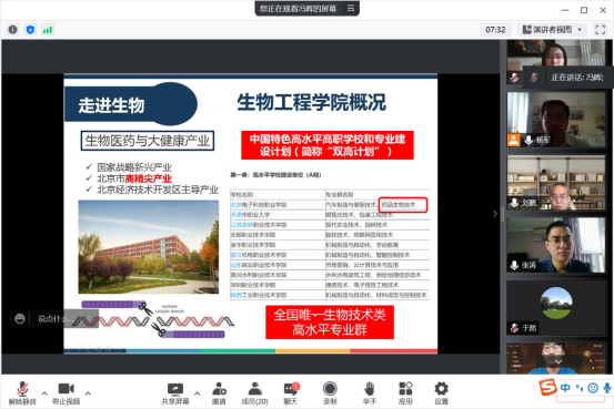 2022年6月8日下午,生物工程学院生物技术系系主任冯晖老师、党支部书记杨军老师、系副主任章宇宁老师和于然老师与大兴二职药品技术系系主任张涛老师、刘鹏老师一起,对大兴二职即将通过“3+2”转段衔接进入生物工程学院的14名学生进行了线上面试。