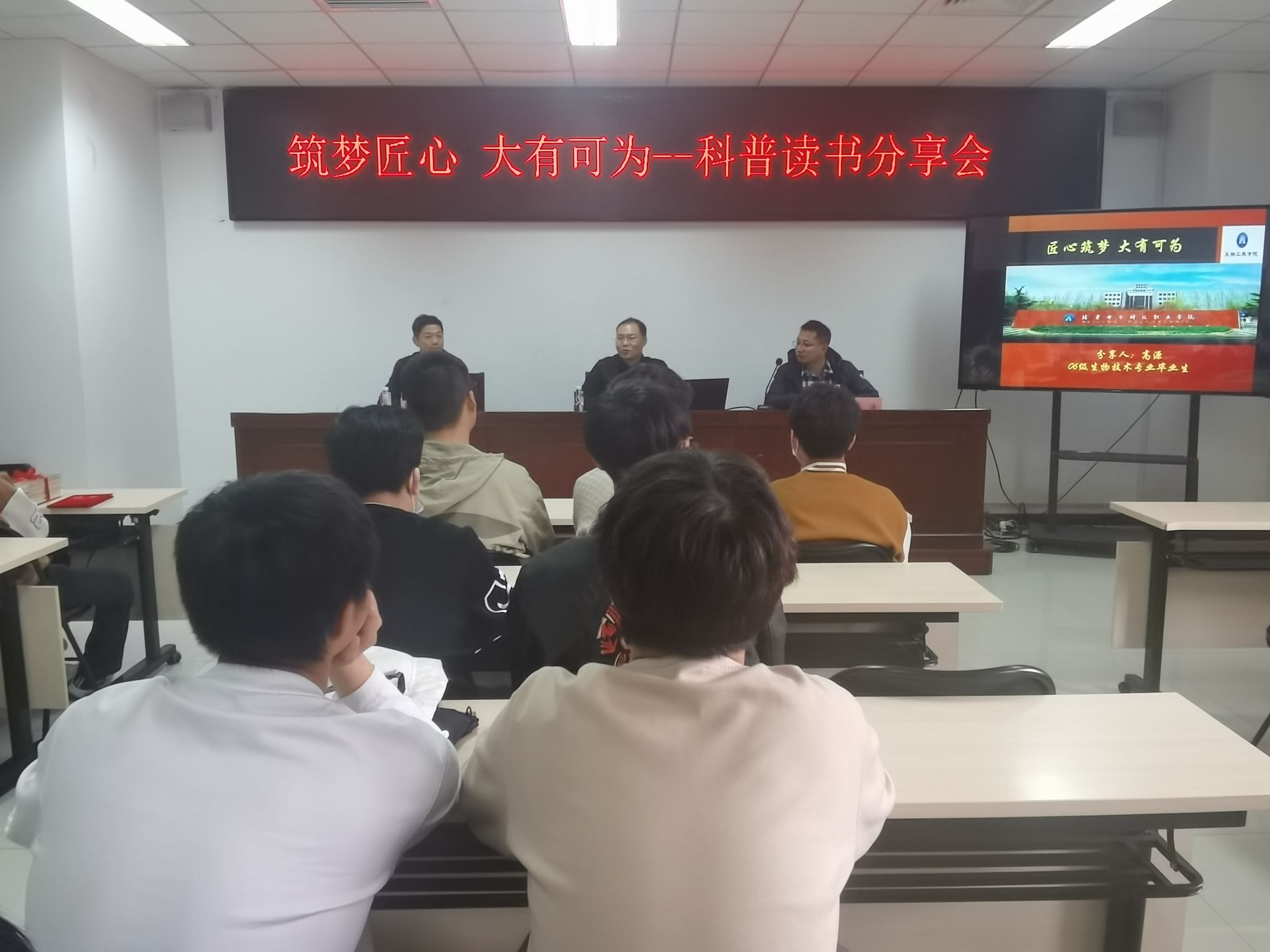 为深入学习宣传贯彻党的二十大精神,教育引导学生树立远大理想,加强学院与校友之间的联系,发挥典型示范引领作用,促进书香校园建设,4月3日,生物工程学院在生物楼433会议室举办了“匠心筑梦 大有可为”——科普读书分享会暨2023年春季学生干部培训会第一讲。本次分享的嘉宾是生物工程学院2009级校友高源,学院党总支副书记刘青山,辅导员胡浩和30余名学生干部参加活动。