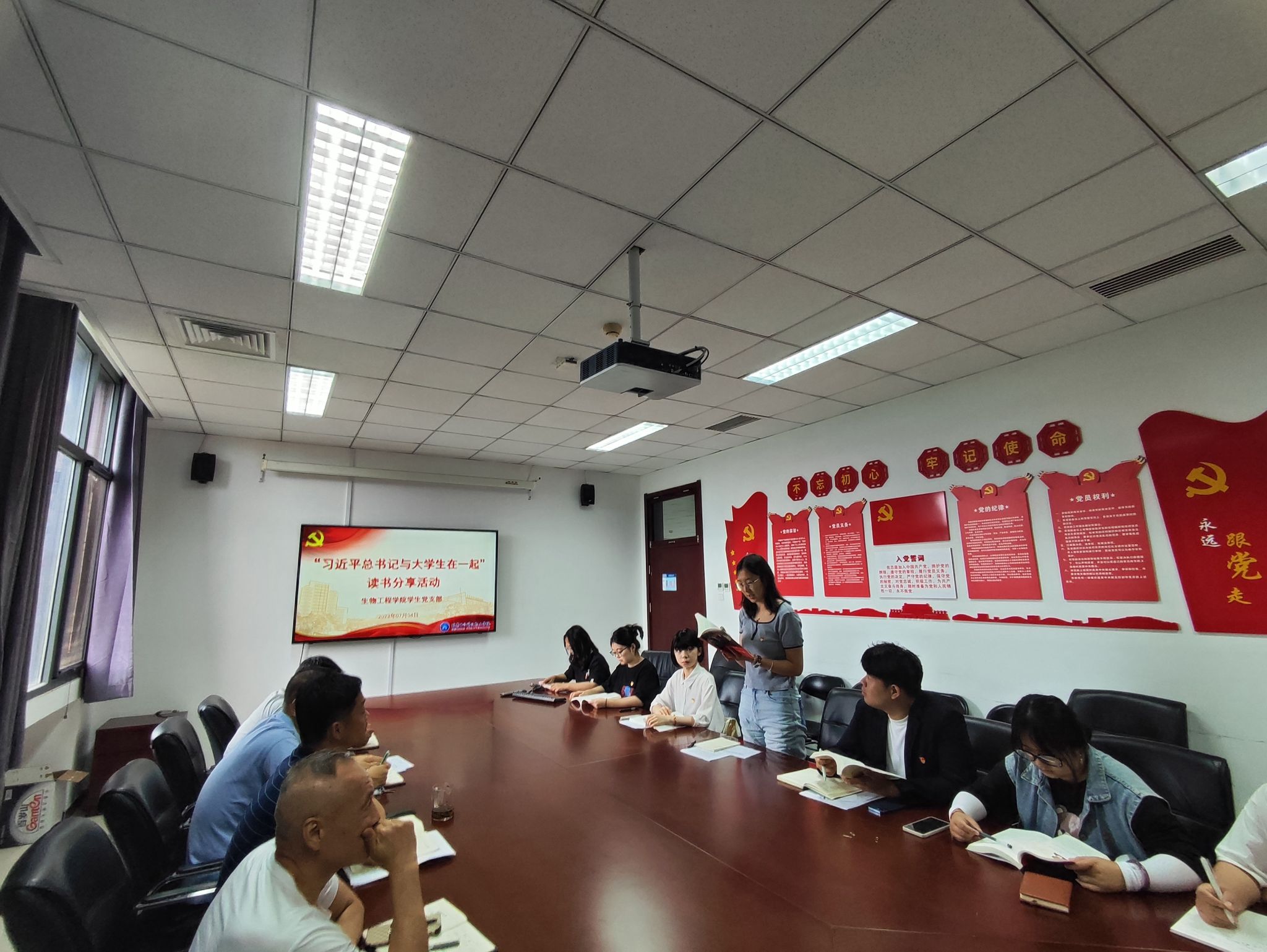 7月4日,生物工程学院学生党支部在生物楼426举行了习近平总书记与大学生在一起”读书班,深入学习贯彻习近平新时代中国特色社会主义思想,扎实推进“学习二十大 永远跟党走 奋进新征程”主题教育实践活动。生物工程学院党总支副书记刘青山,学生党支部书记寇明刚以及全体支部党员参加本次活动。