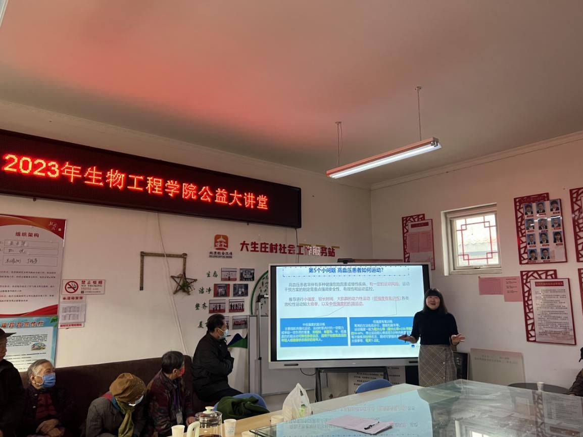 《国务院关于做好2023年全面推进乡村振兴重点工作的意见》中指出,全面建设社会主义现代化国家,最艰巨最繁重的任务仍然在农村。乡村振兴战略是国家战略,而农民的健康是乡村振兴的基础。为关爱农民身体健康、提高农民将康素养,生物工程学院积极联系大兴区大生庄村委会,让公益大讲堂系列讲座走进乡村。