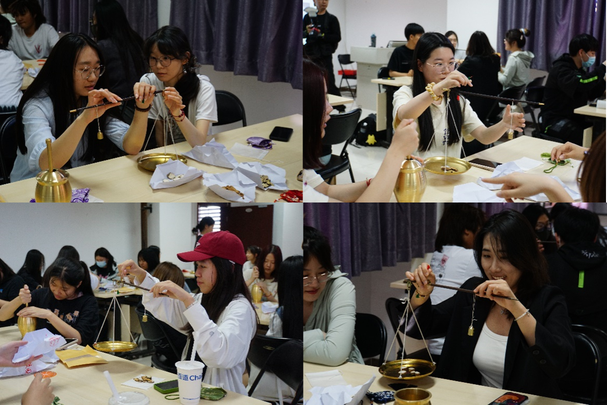 随后,同学们开始动手制作提神醒脑香囊,在老师的介绍下他们依次辨别并称量了川穹,苍术,白芷,冰片等,然后根据指导,将这些中药材研磨成粉末,按照比例将药粉放在防漏网袋中,然后再装入精美的布袋中,一个个精美的中药香囊便制作完成了。