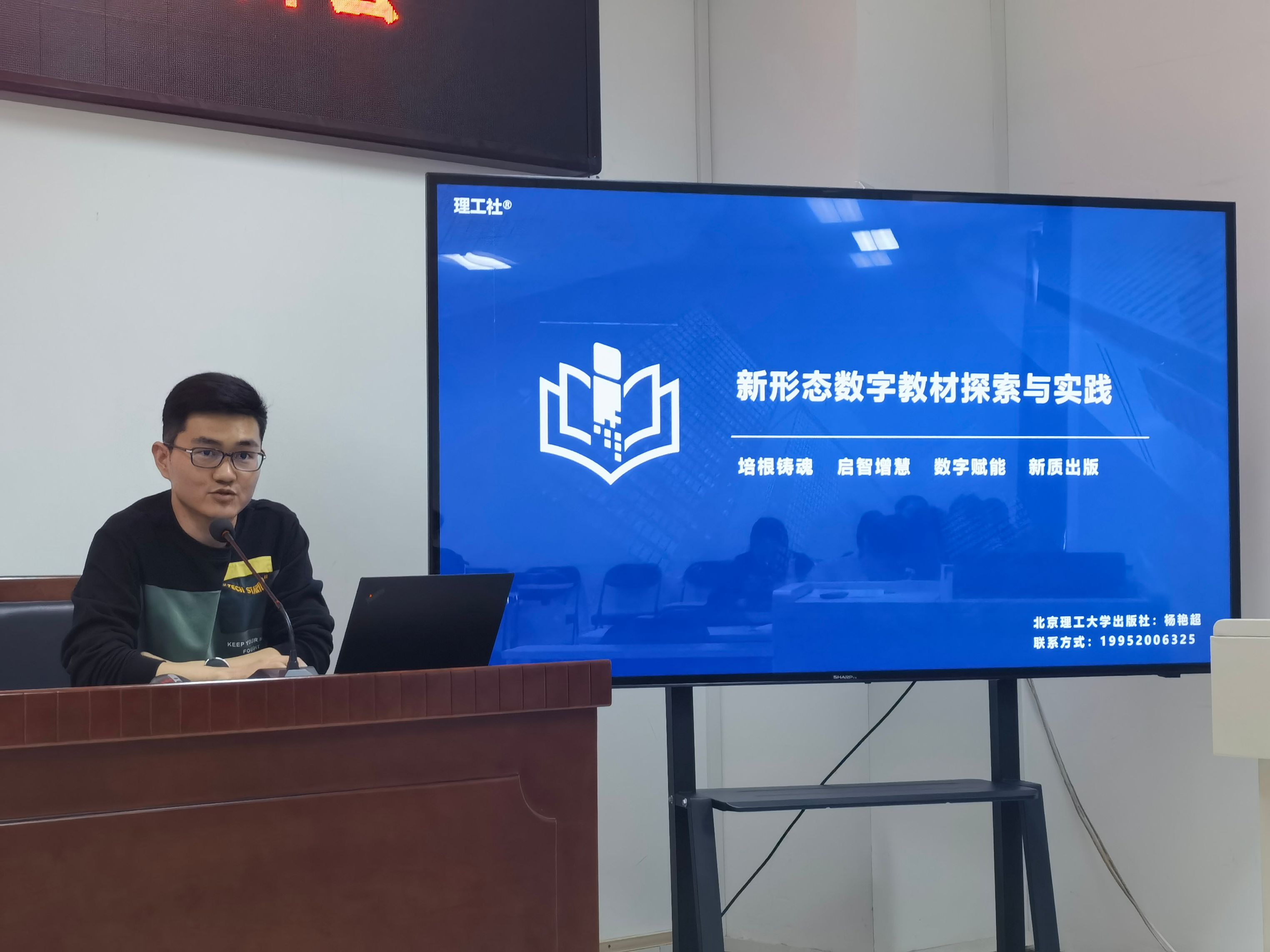 随后,北京理工大学出版社数字教育出版分社杨艳超编辑为教师们分享了数字教材领域的探索与实践经验。他详细介绍了数字教材的政策背景、优势特点、出版流程与编写技巧,以及智慧数字教材的解决方案,为教师们在数字教材的创作与应用上提供了实用的指导。