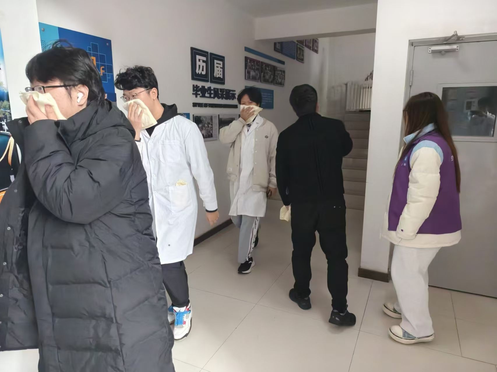 随着警报声的骤然响起,生物工程学院各实验室、教室迅速进入紧急状态。师生们在接到疏散指令后,按照事先安排好的逃生路线,迅速而有序地撤离至安全区域。在整个过程中,大家用毛巾捂住口鼻,弯腰低姿,确保了在模拟烟雾环境中的安全撤离。