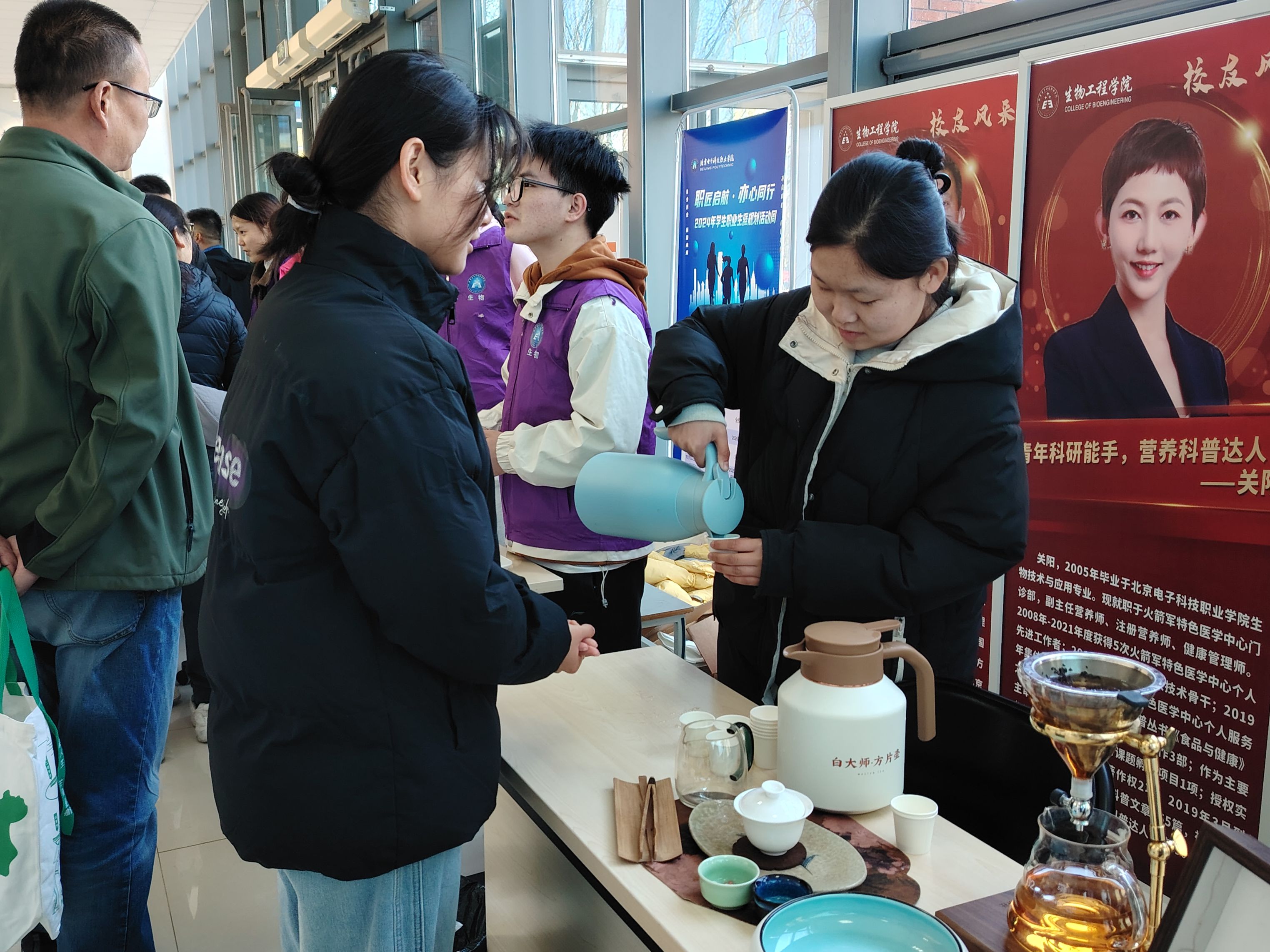 活动中,茶社成员陈佳奇、徐欣欣等积极为来访者提供茶饮服务,并介绍茶文化知识。通过茶文化体验与专业咨询相结合的方式,活动有效宣传了生物工程学院的专业特色和学术氛围。