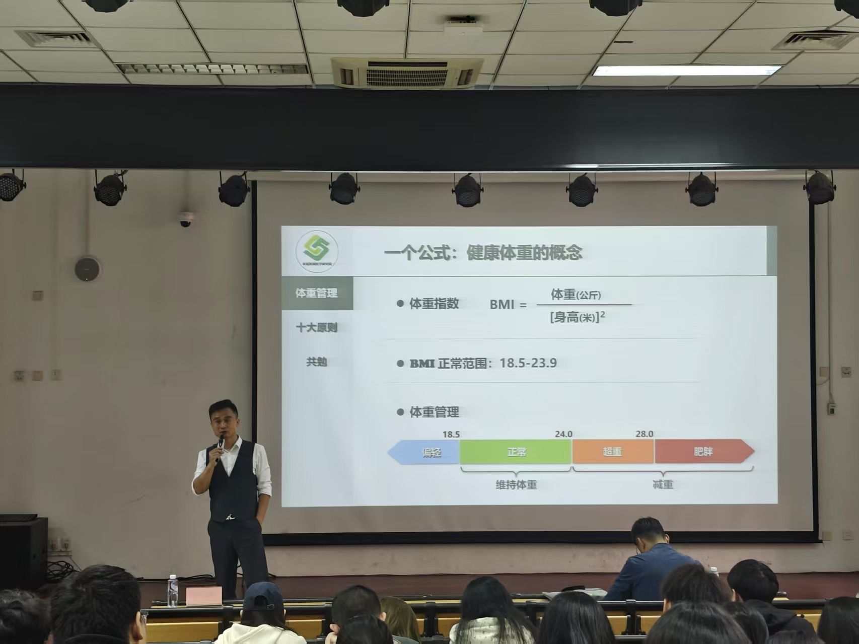 在理论知识讲解环节,王旭峰介绍了健康体重的概念,通过讲解体重指数(BMI)公式,让大家能科学判断自身健康体重状况。同时,他讲解了成年人能量消耗中基础代谢、食物热效应和体力活动等概念,帮助同学们了解能量代谢原理。
