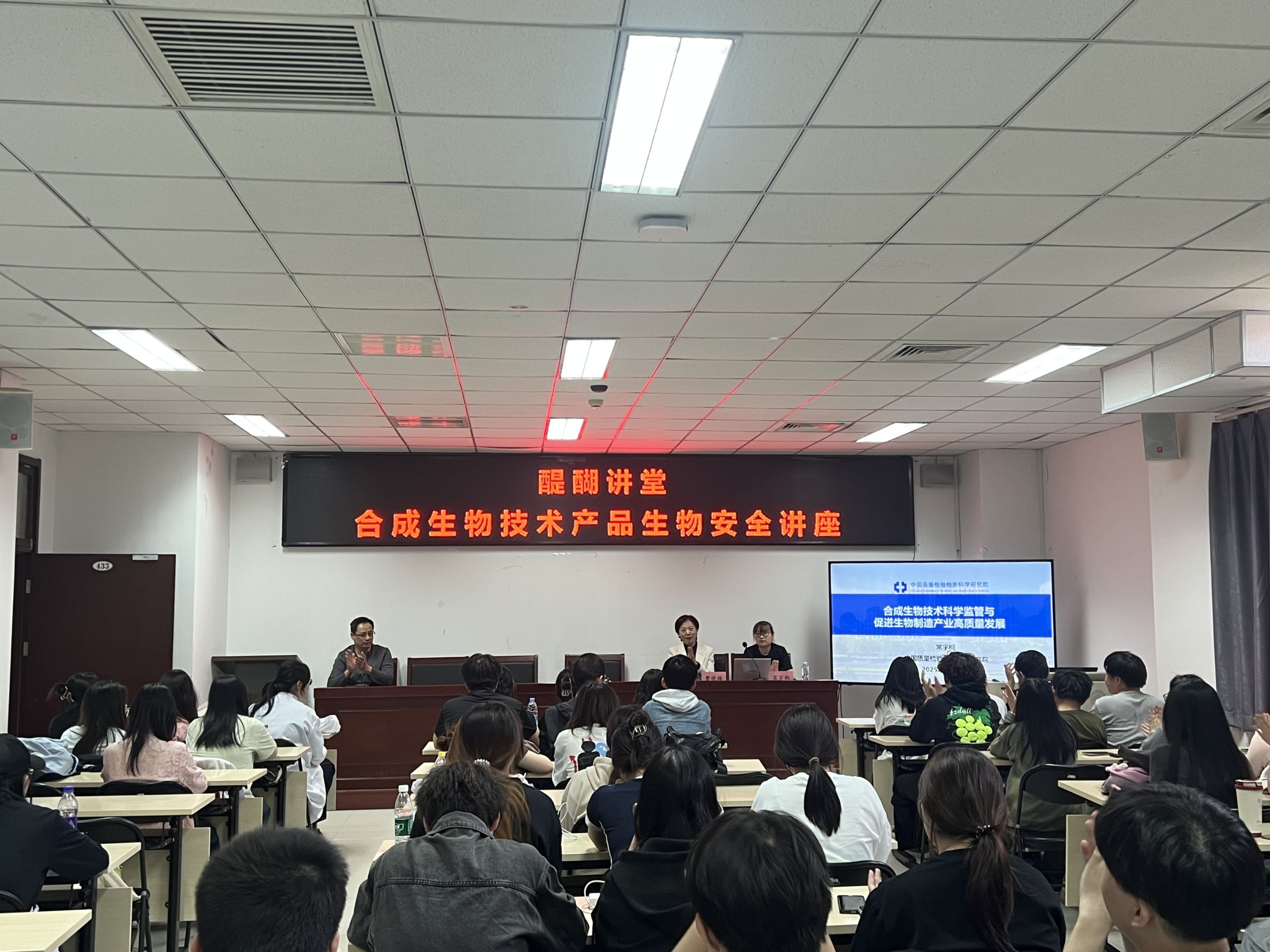 为深化师生对合成生物技术的理解,推动学科前沿与产业实践的深度融合,生物工程学院于近日成功举办“醍醐讲堂——合成生物技术产品生物安全”主题学术讲座。来自中国质量检验检测科学研究院的专家曹晓梅研究员和常宇桐研究员担任主讲嘉宾,围绕合成生物技术的基础知识、应用现状、发展前景及生物安全议题开展深度解析。生物工程学院食品技术系24级的同学们参加了此次活动。