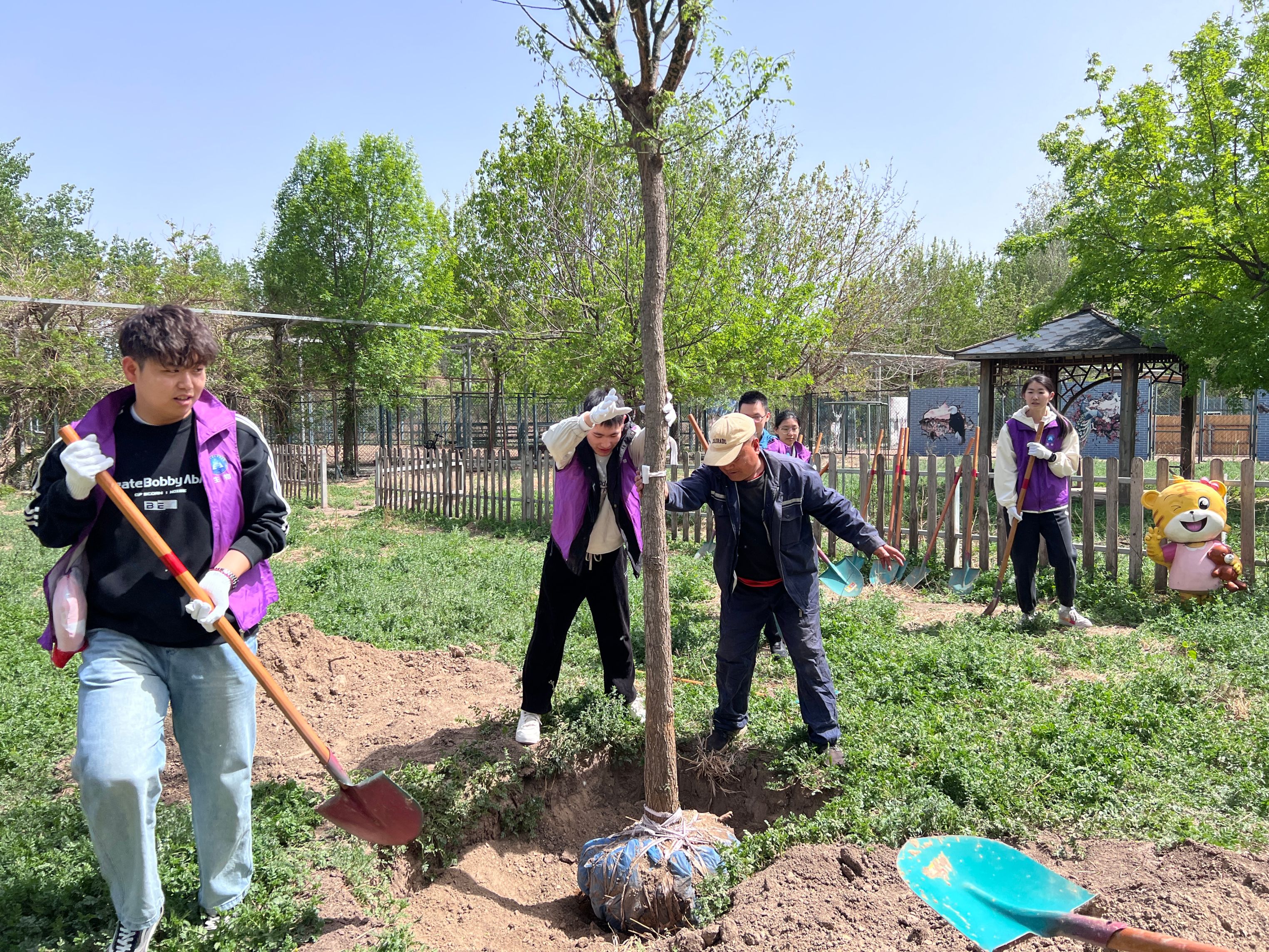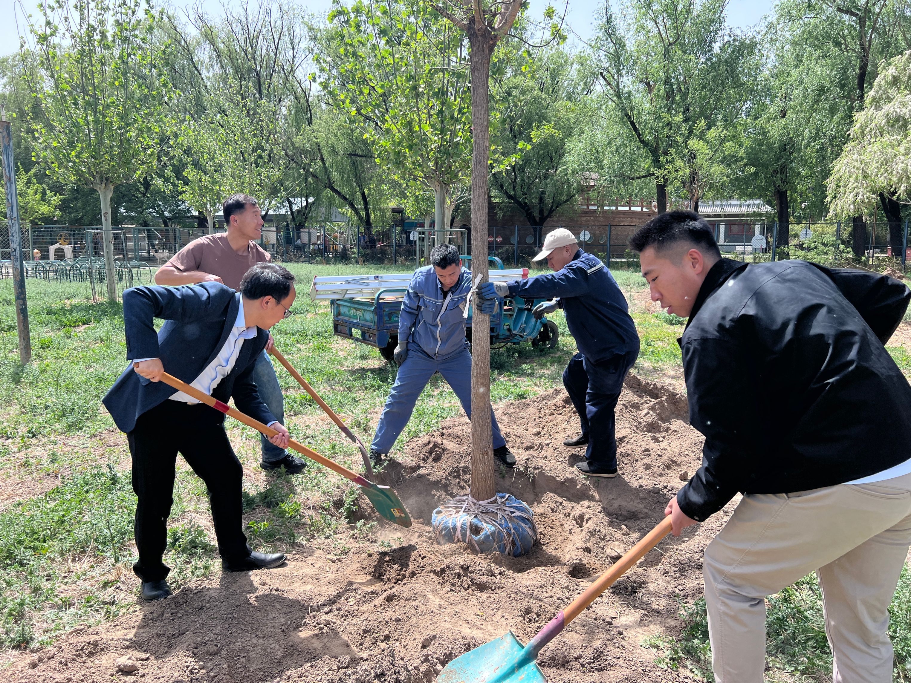 春风催新绿,植树正当时。师生一行来到北京麋鹿生态实验中心生态修复区。在中心技术人员的指导下,挖坑、培土、浇水,分工协作开始植树工作。大家采用“3人一组”协作模式:1人扶正树苗、调整角度,2人挥锹培土、分层压实,植树现场一派繁忙景象。陈亮在劳动中强调:“植树不仅是体力劳动,更是对生态文明建设的躬身实践。大家要将课堂知识转化为生态保护的实际行动,理解‘绿水青山就是金山银山’的深刻内涵。”经过共同奋战,错落扎根的槐树在现场勾勒出一幅生机勃勃的绿色画卷。