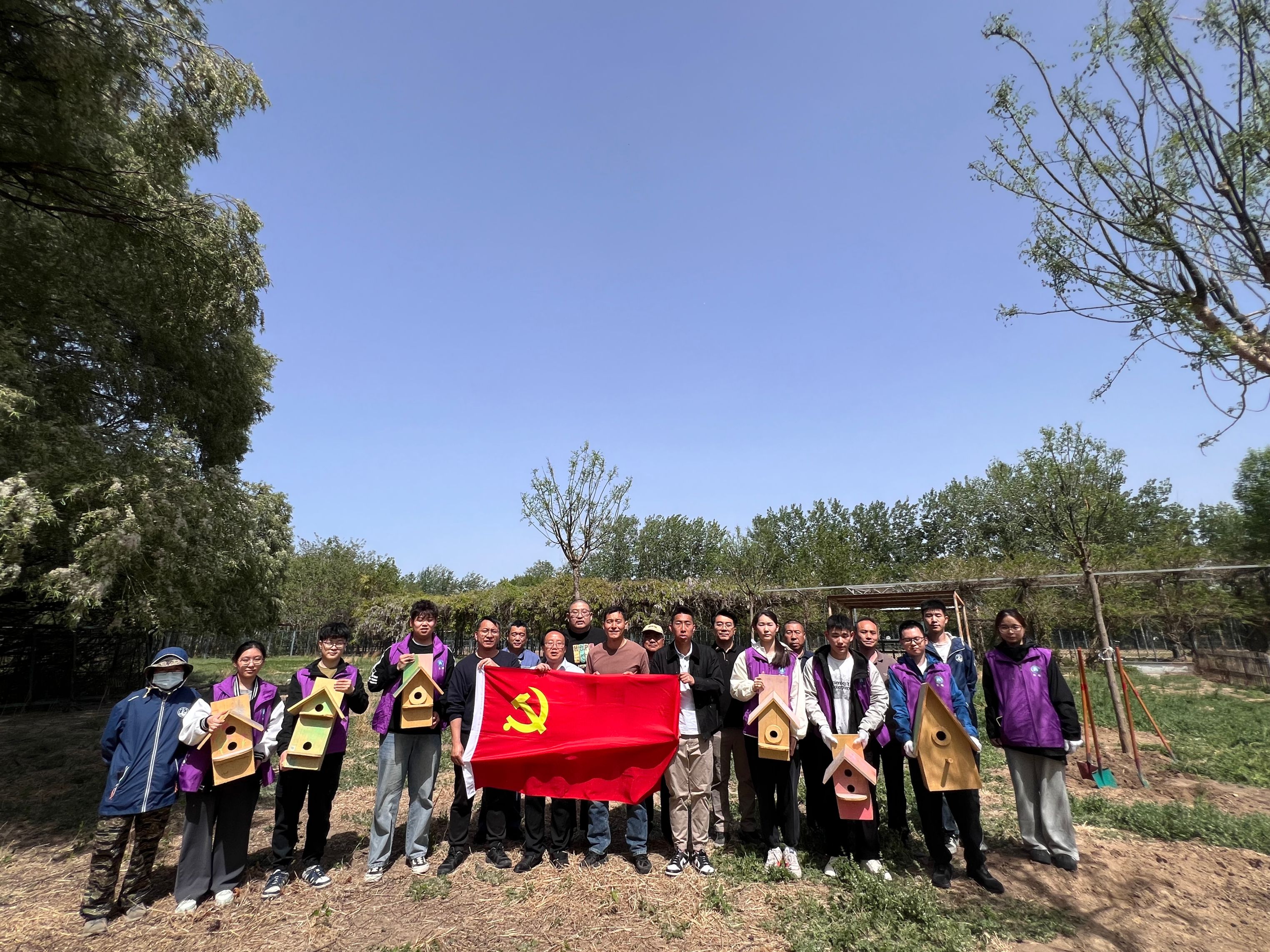 植树活动后,大家共同开展“共挂生态鸟笼”行动,逐一将制作好的鸟笼放置在刚刚栽培好的槐树上。这些由生物学子和中心工作人员共同制作和涂色的鸟笼,结合南海子公园鸟类栖息习性进行了结构优化,既为鸟类提供安全居所,又避免干扰了自然生态。