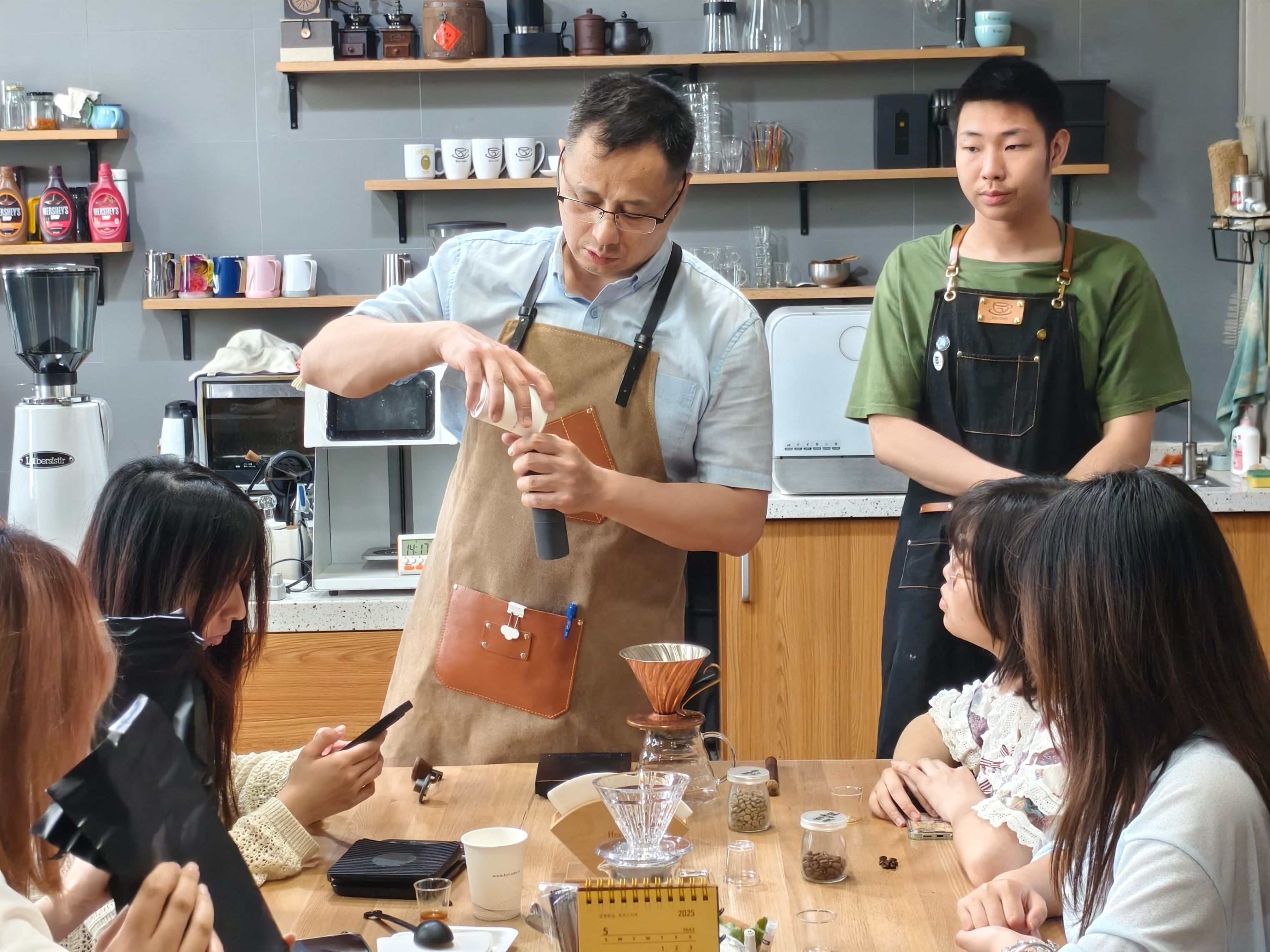 随后,手冲咖啡的制作教学同样精彩纷呈。“手冲咖啡讲究水流的控制和萃取的时间,这就像是一场与咖啡的对话。”于老师一边讲解,一边进行演示,从温杯、称量咖啡豆、研磨,到注水闷蒸、绕圈萃取,行云流水的操作让新成员们赞叹不已。培训学员在反复练习中,逐渐掌握了手冲的技巧,看着清澈的热水与咖啡粉交融,慢慢萃取出深褐色的咖啡液,大家对咖啡制作的理解更加深刻。
