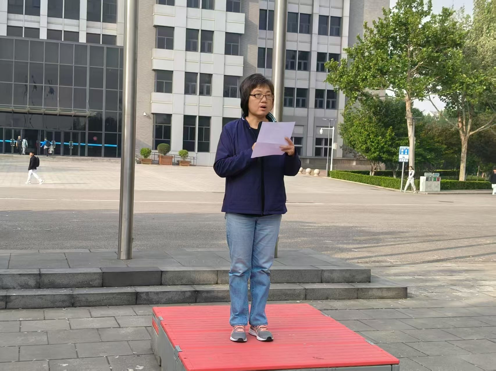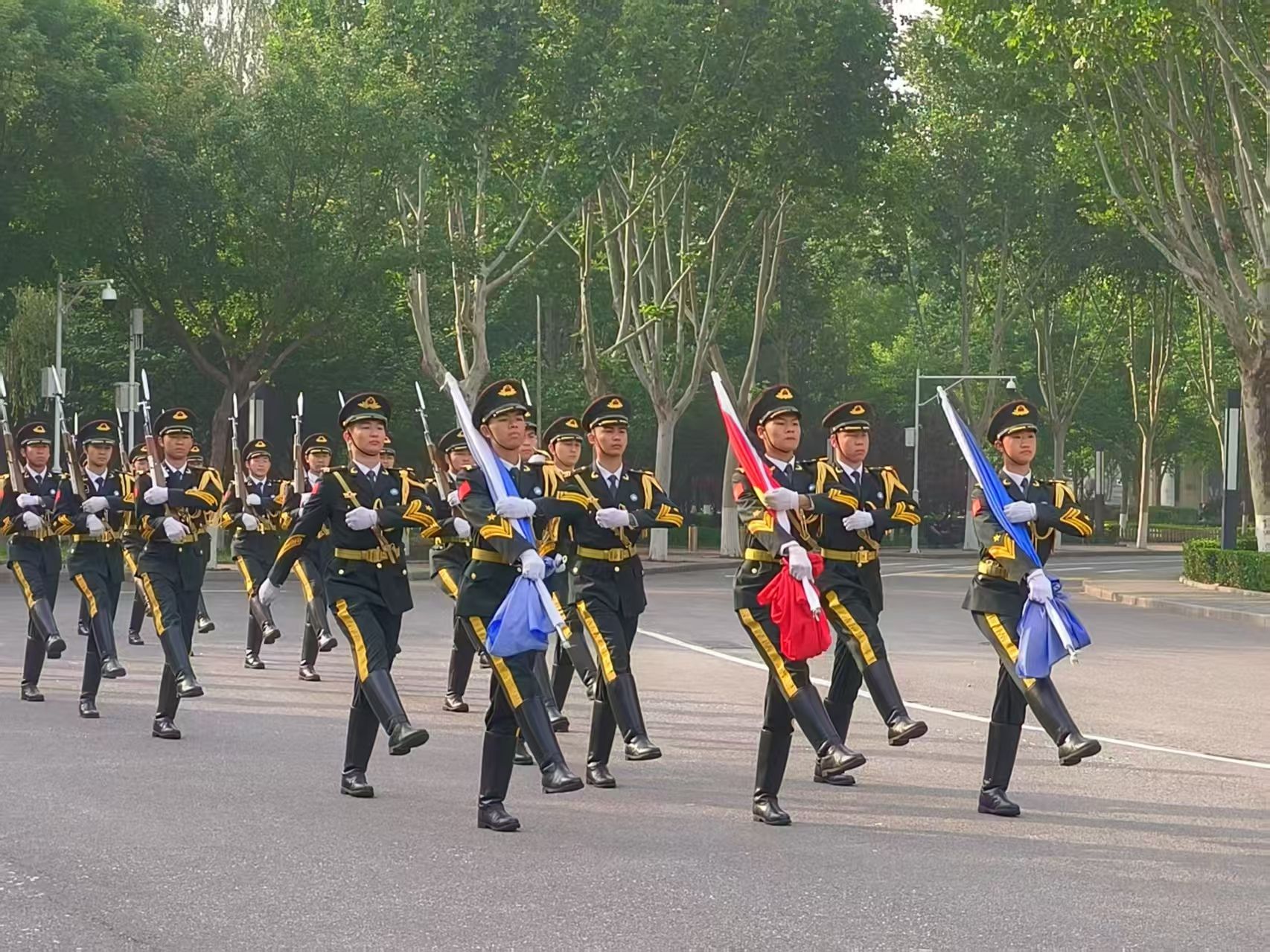 清晨七点,旭日初升,国旗护卫队擎旗昂首,正步行进。在全体师生的注目礼中,五星红旗迎着晨光冉冉升起。