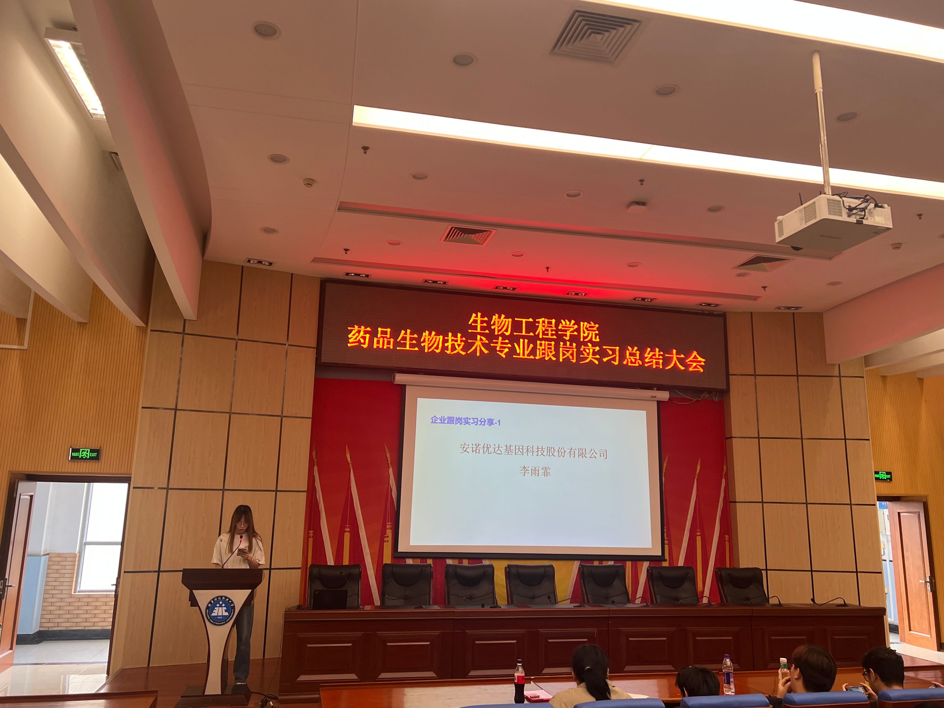 在总结大会上,学院对本次跟岗实习的整体情况进行了回顾,并邀请优秀实习生代表分享心得体会。来自安诺优达基因科技股份有限公司的李雨霏等20名同学因表现突出,荣获“优秀实习生”称号,并现场领取了荣誉证书。